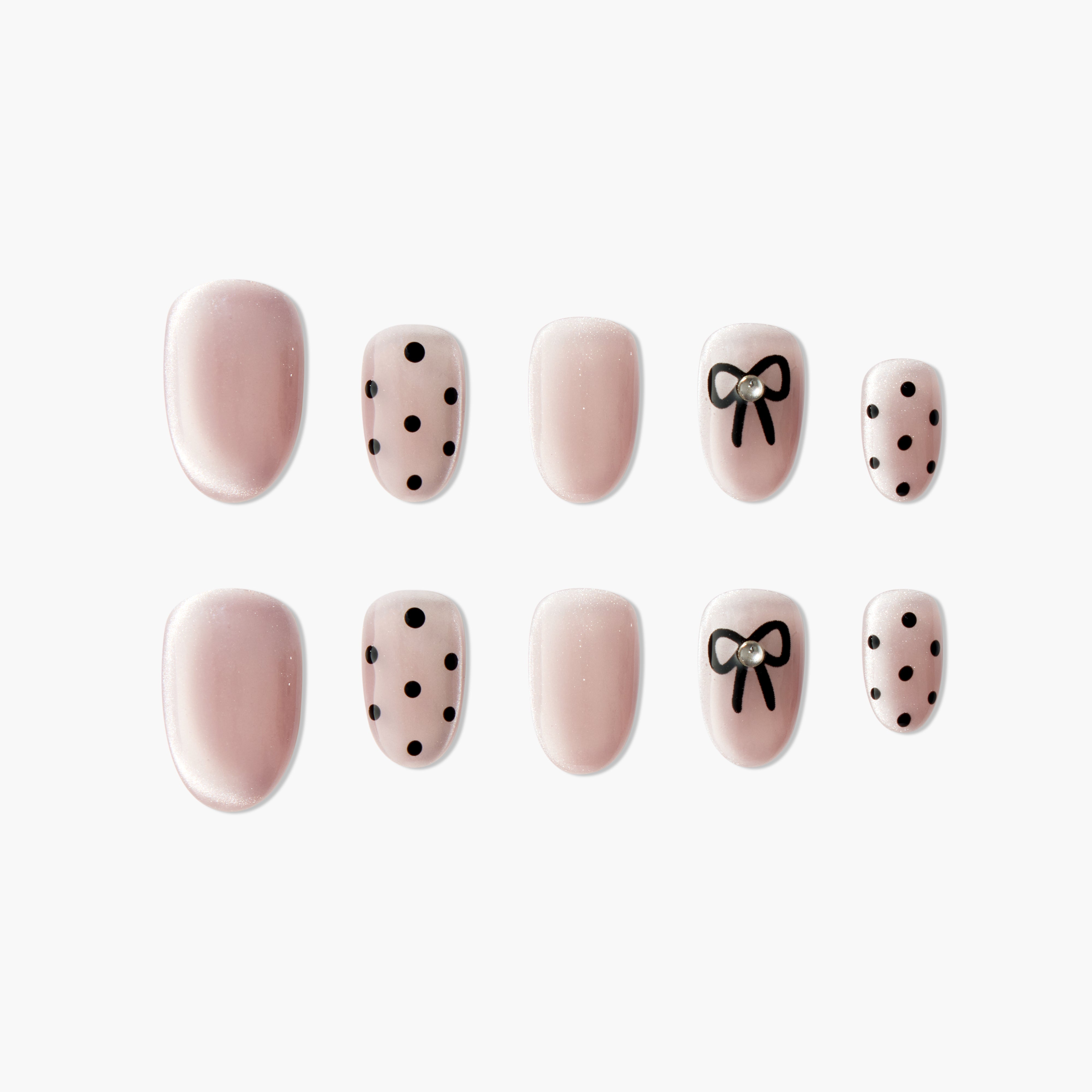 Eine charmante Mischung aus Nude und Schwarz, Vintage Chic Press-On Nails bietet verspielte Schleifendesigns mit Perlakzenten. Perfekt für jeden Anlass verleihen diese Nägel Ihrem Look einen Vintage-Flair und Eleganz.