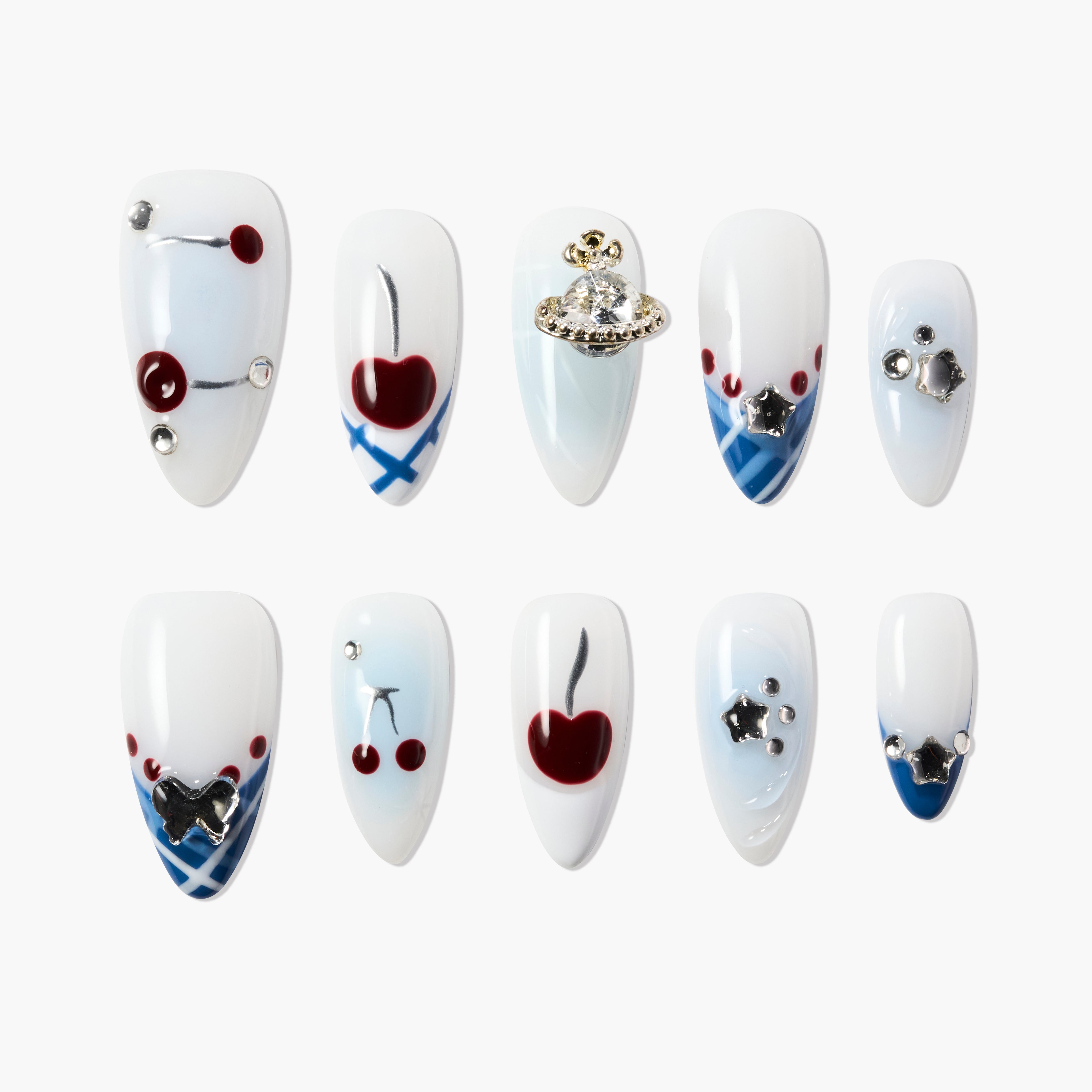 Las uñas postizas hechas a mano de Emily's Cherry Planet presentan una base fresca en azul y blanco, decorada con cerezas rojo intenso, estrellas metálicas y un charm 3D de planeta para un ambiente divertido pero futurista. Cada pieza está hecha a mano para un ajuste seguro y reutilizable, perfecto para fiestas, moda urbana y estilos atrevidos diarios.