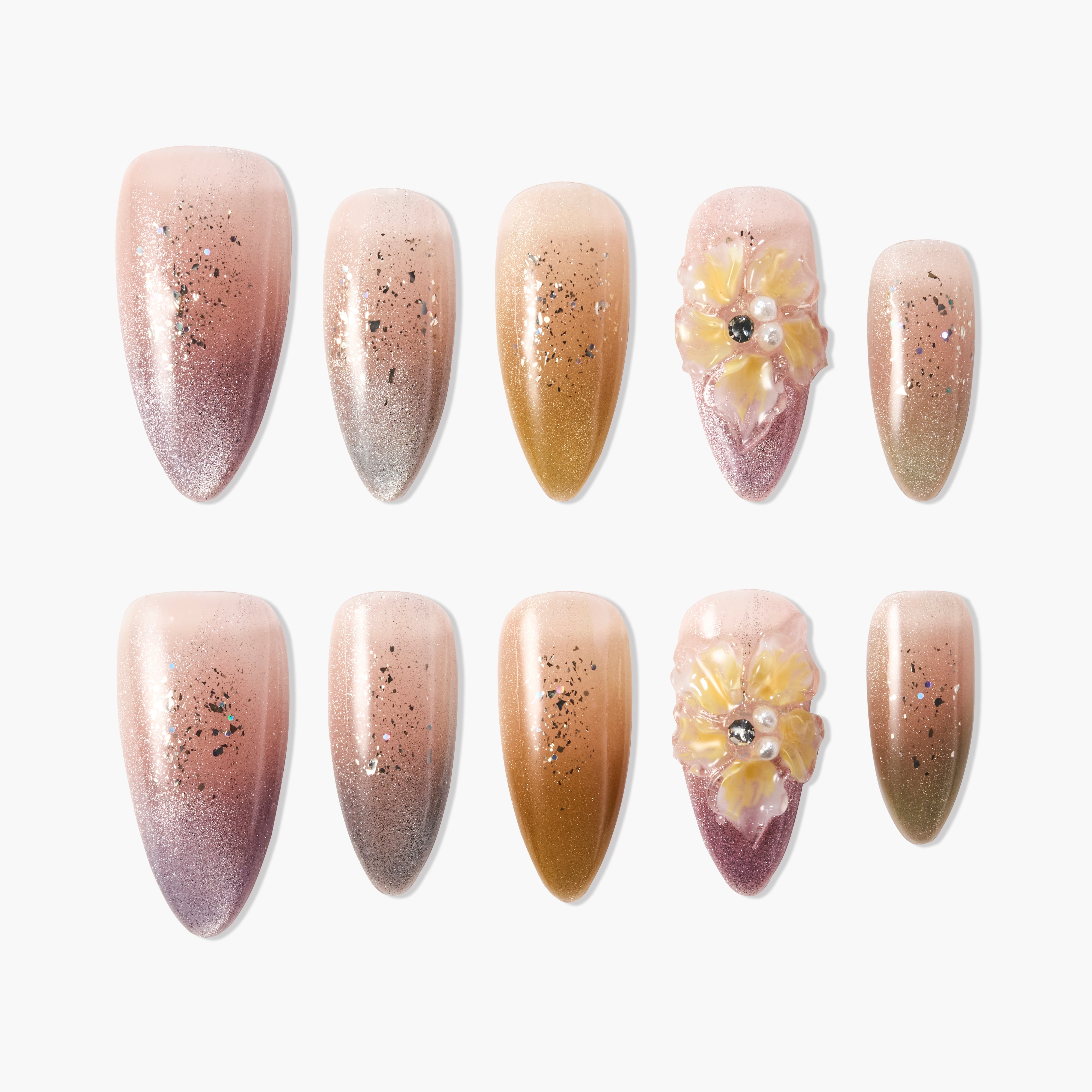 Las uñas postizas Golden Petal Glow de Emily’s Nail presentan degradados brillantes, detalles con purpurina y acentos florales 3D para un aspecto cálido y radiante.