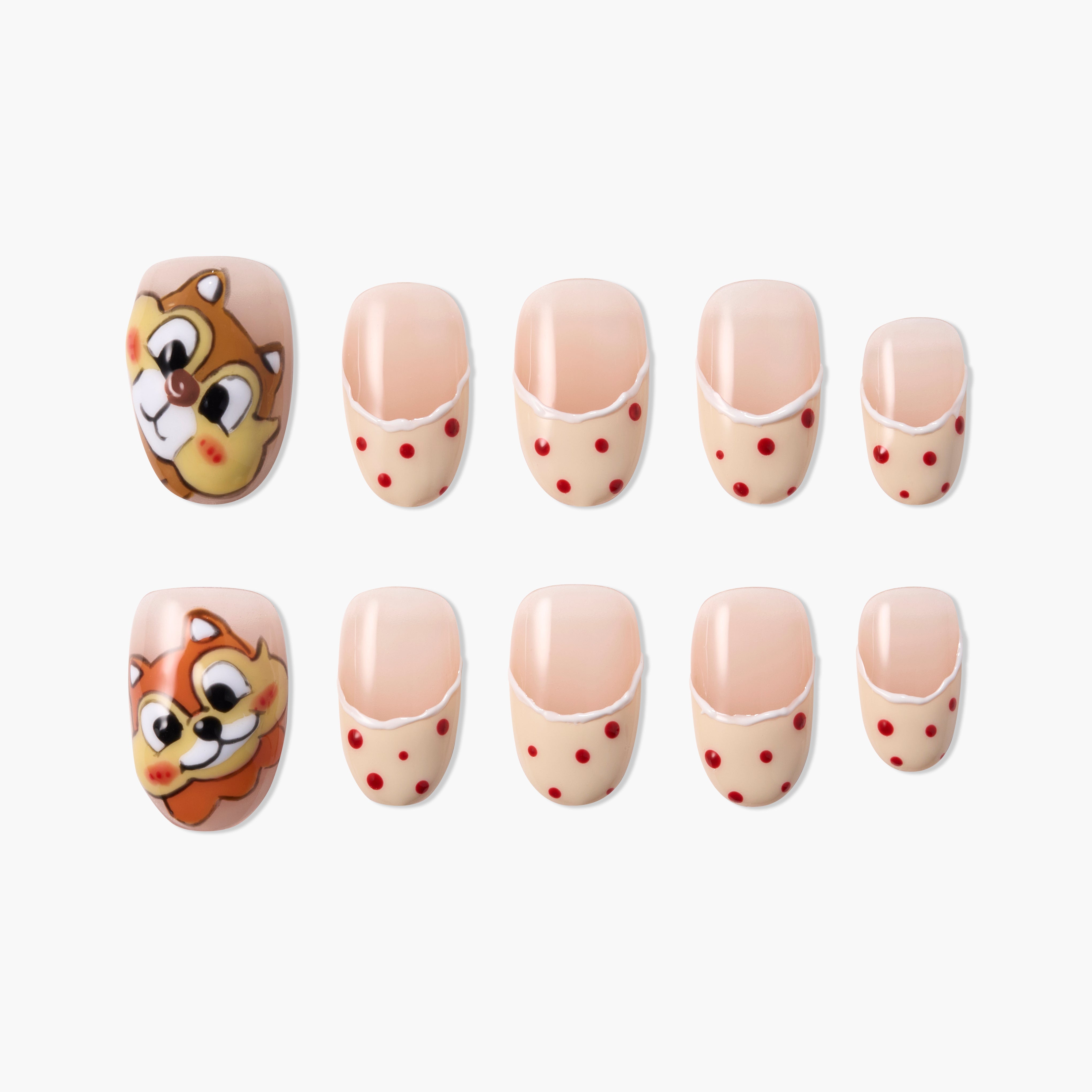 Cheery Chipmunk은 사랑스러운 다람쥐 일러스트와 크리미 누드 톤, 장난기 가득한 빨간색 물방울 무늬가 어우러진 수제 프레스온 네일 세트입니다. 부드러운 프로스팅 같은 프렌치 팁과 쾌활한 캐릭터 포인트 네일이 매력적이고 따뜻하며 젊은 분위기를 연출합니다. 귀엽고 아늑한 미학을 좋아하는 누구에게나 완벽한 일상 스타일입니다.