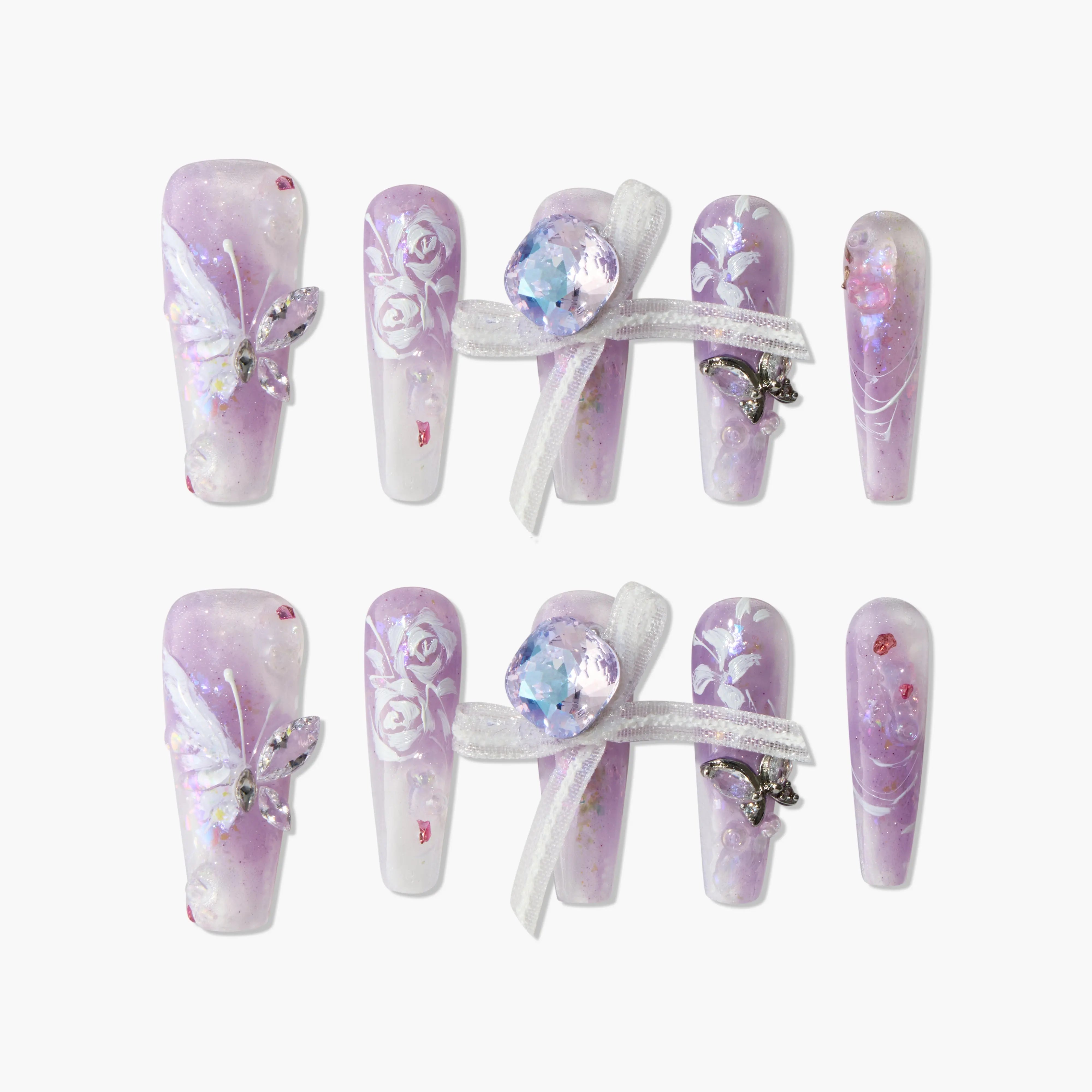 Amethyst Butterfly Dream features a romantic purple base adorned with delicate crystal butterflies, hand-painted white roses, and elegant lace ribbons, exuding a sense of sophistication and fantasy. The nails are enhanced with fine starry glitter, resembling a twilight glow over a floral meadow. Perfect for romantic dates, evening galas, or formal occasions, this nail set adds a touch of unique elegance and ethereal charm to your fingertips.