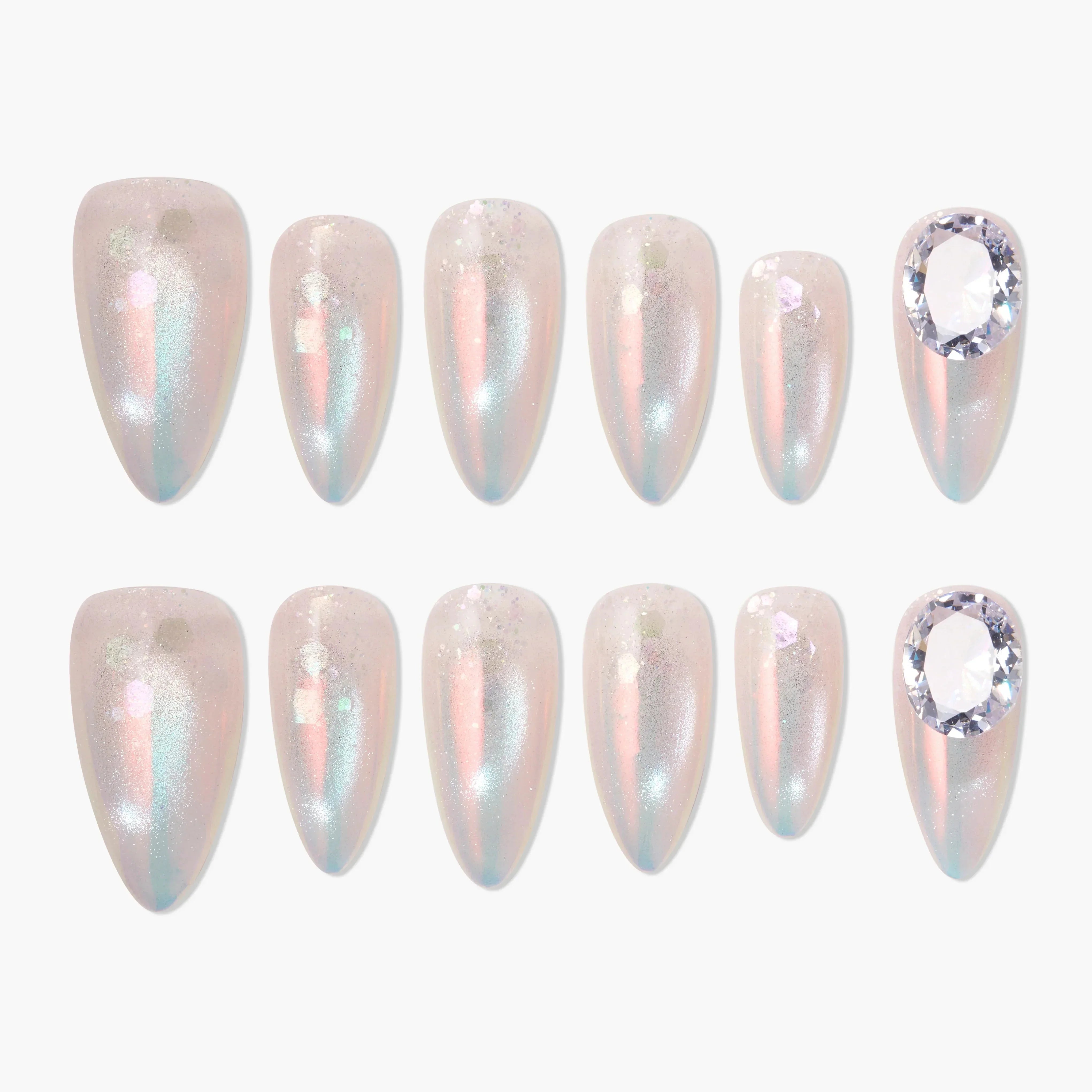 Aurora Pearl Drift is a handmade press-on nail set inspired by soft aurora reflections and delicate pearl shimmer. The translucent milky base is layered with subtle pastel light shifts—cool mint, blush pink, and icy silver—creating a refined, weightless glow. Fine iridescent flakes add depth without overpowering the design, while the crystal accent nail brings a quiet touch of luxury. Smooth, minimal, and effortlessly elegant, this set is perfect for brides, formal occasions, or anyone who loves a clean, luminous look. Ready in 10 minutes and handcrafted for comfort and durability.