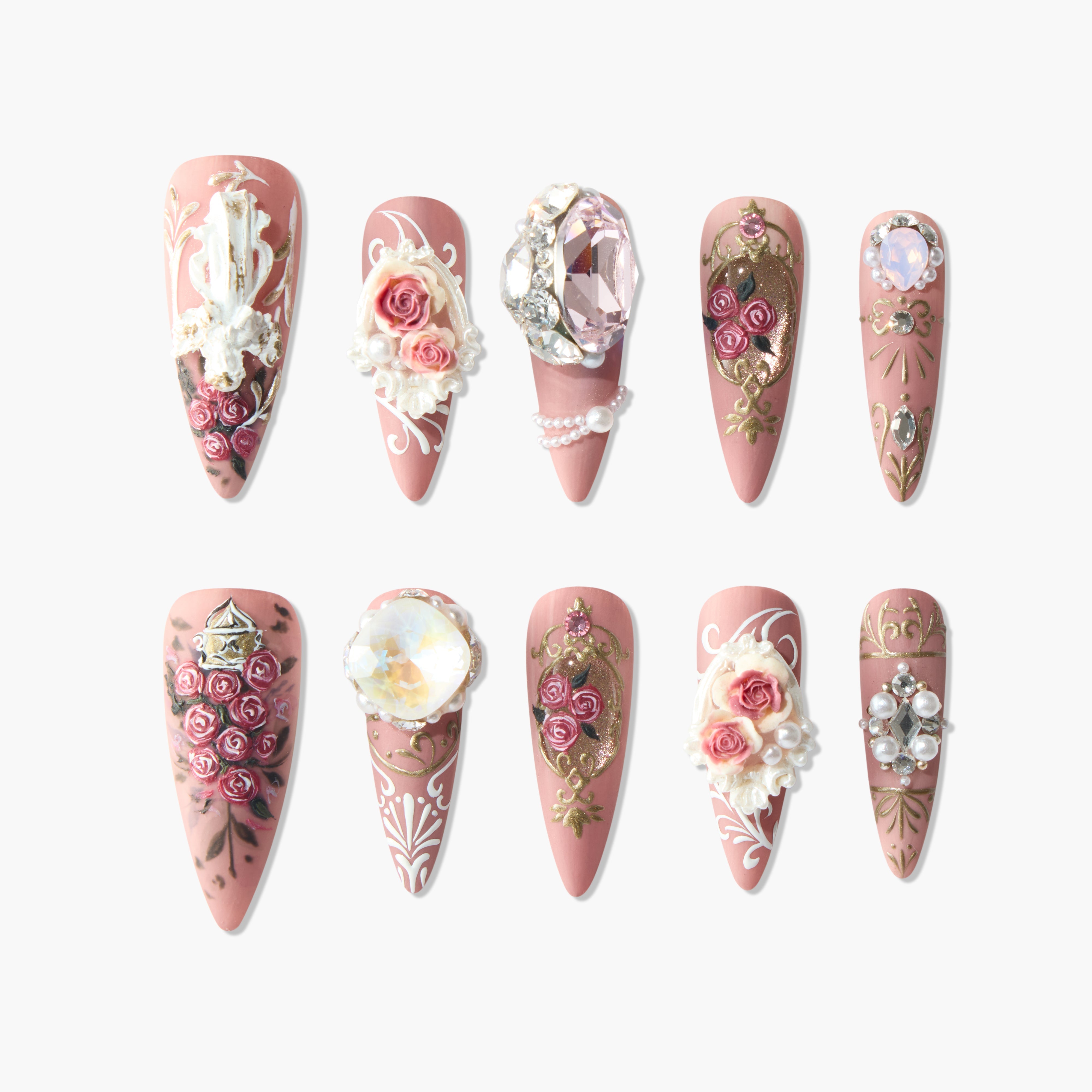 The Baroque Rose Press-On Nails feature a vintage rose-pink base adorned with 3D rose accents, pearl embellishments, and luxurious gold baroque-style scrollwork. These nails exude royal elegance and opulence, reminiscent of classic palace aesthetics. Each nail is meticulously designed like a piece of art, offering a unique and sophisticated manicure experience. Crafted with eco-friendly, high-quality materials, they are lightweight and comfortable, ideal for weddings, parties, or special occasions, elevating your style with regal charm.