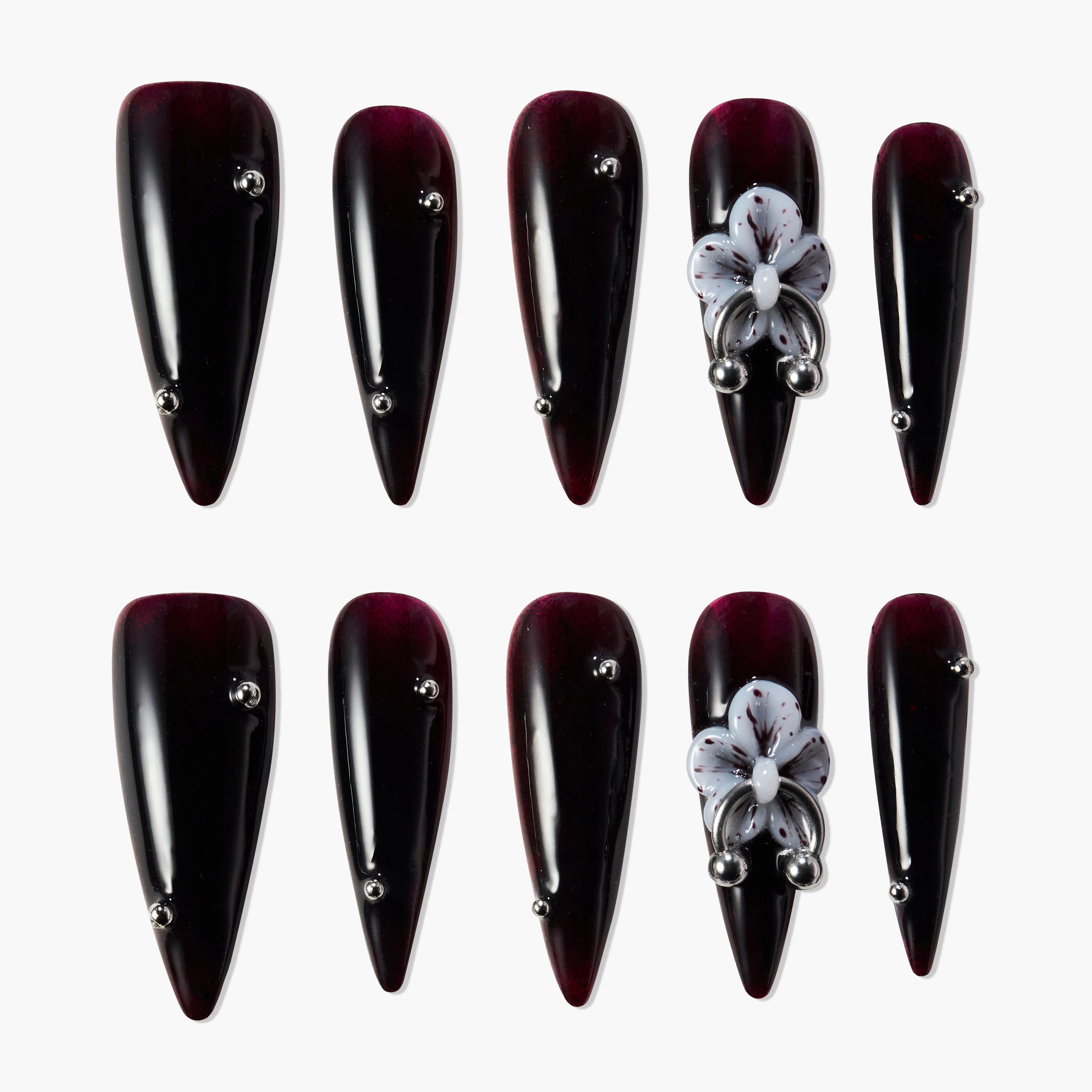 Black Sakura Bloom press-on nails by Emily’s Nail feature a dark wine-red gradient base with metallic studs and 3D floral art, creating a mysterious and bold look perfect for edgy elegance.