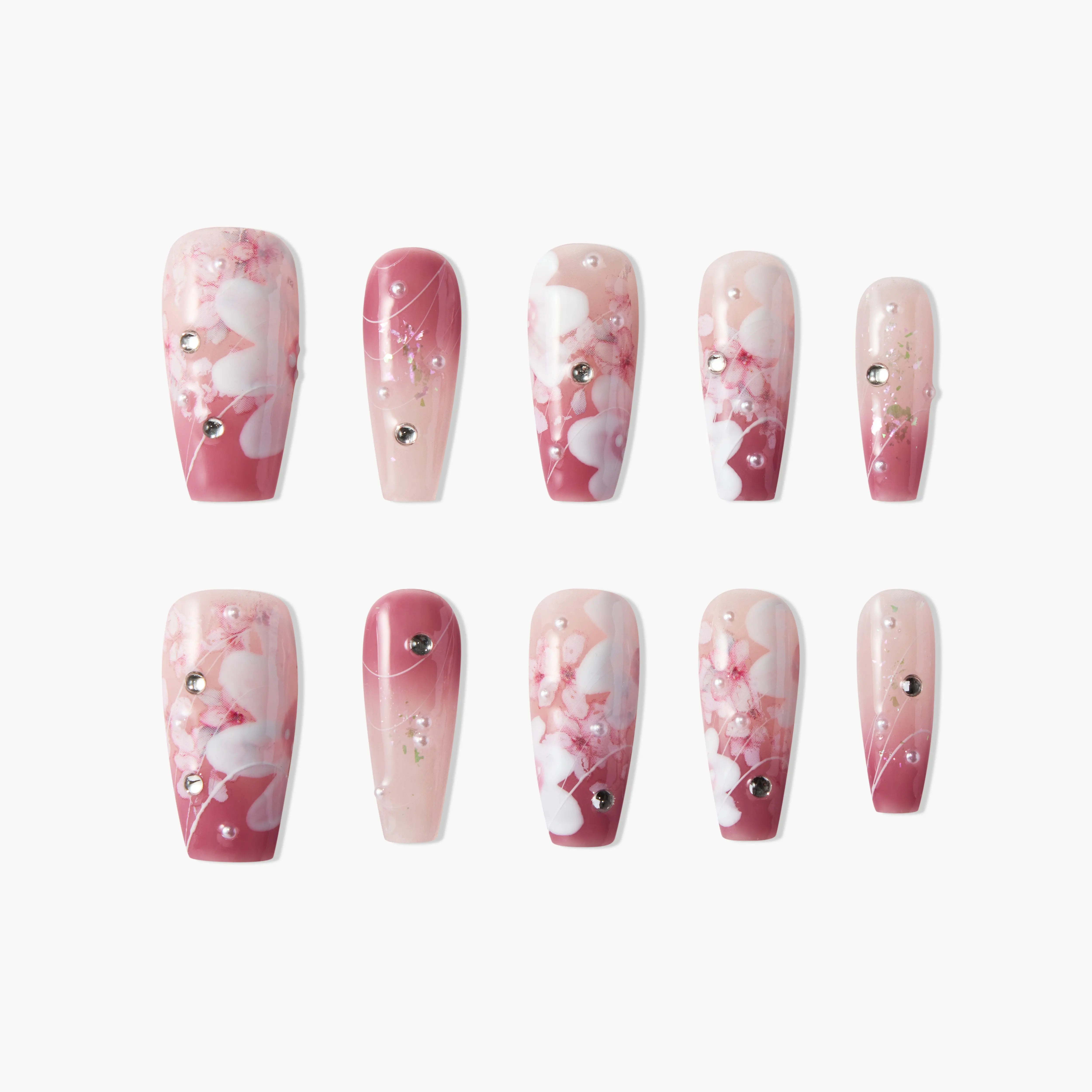 Blossom Dreams nail series draws inspiration from blooming flowers, featuring soft pink and white gradient shades that create a dreamy effect. Each nail is adorned with delicate floral patterns, while sparkling diamonds and pearls enhance the romantic feel. The gentle floral details and pearlescent shine evoke a fresh and elegant springtime vibe, perfectly capturing the lightness and beauty of flowers.