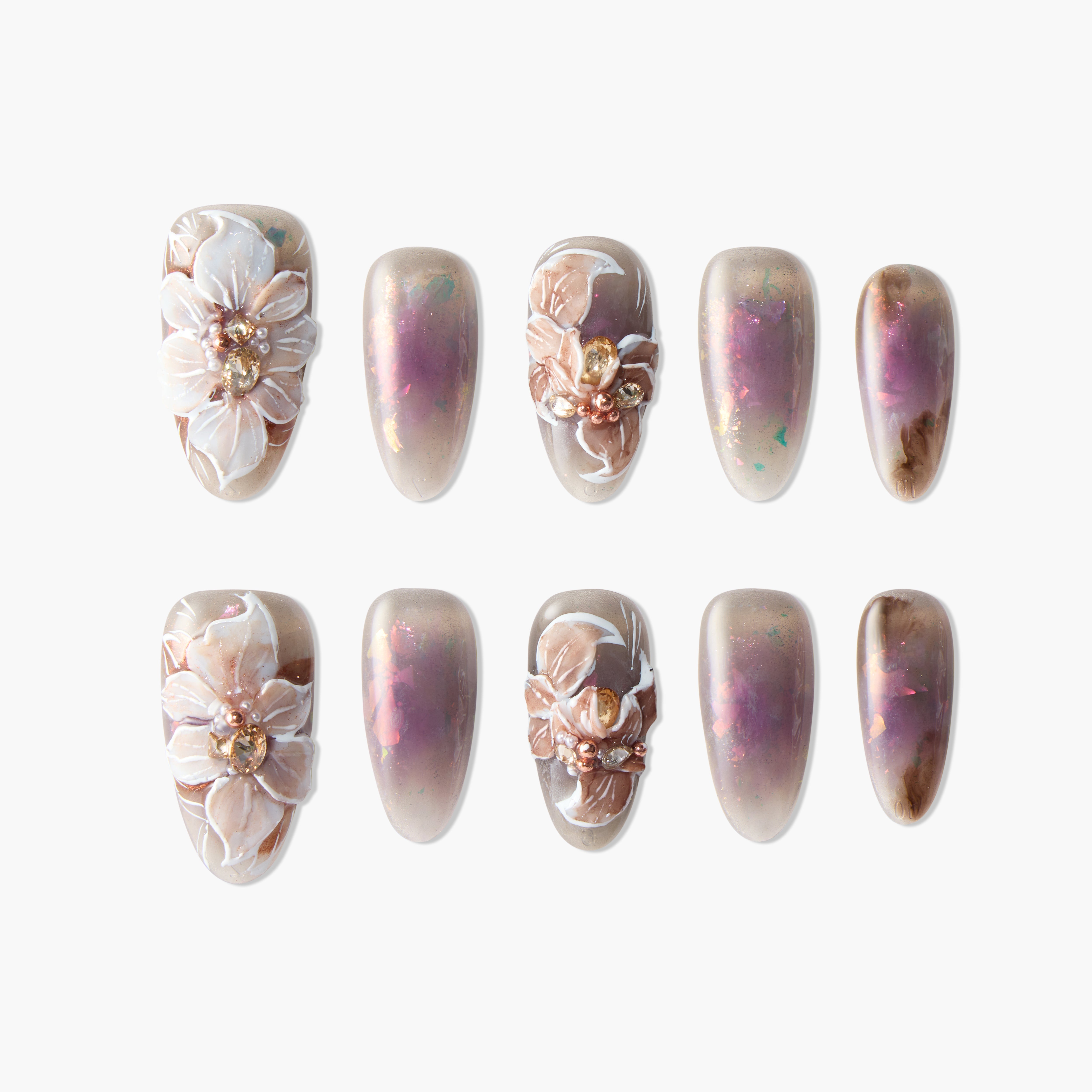 The "Blossom Elegance" features soft pink and beige gradients, adorned with intricate floral designs and sparkling gemstones. This design combines romance and elegance, making it the perfect choice for those who seek a refined and charming look for any occasion.