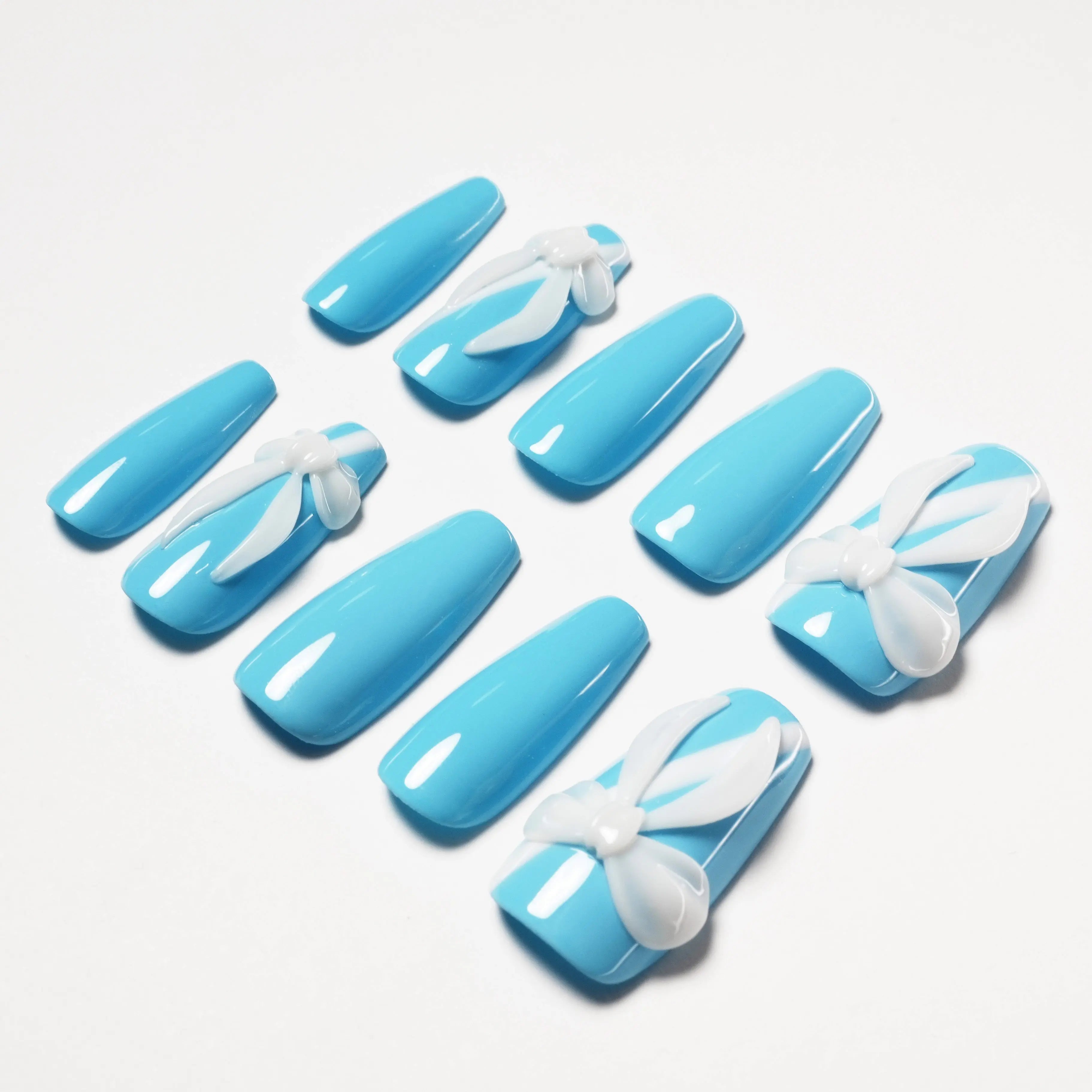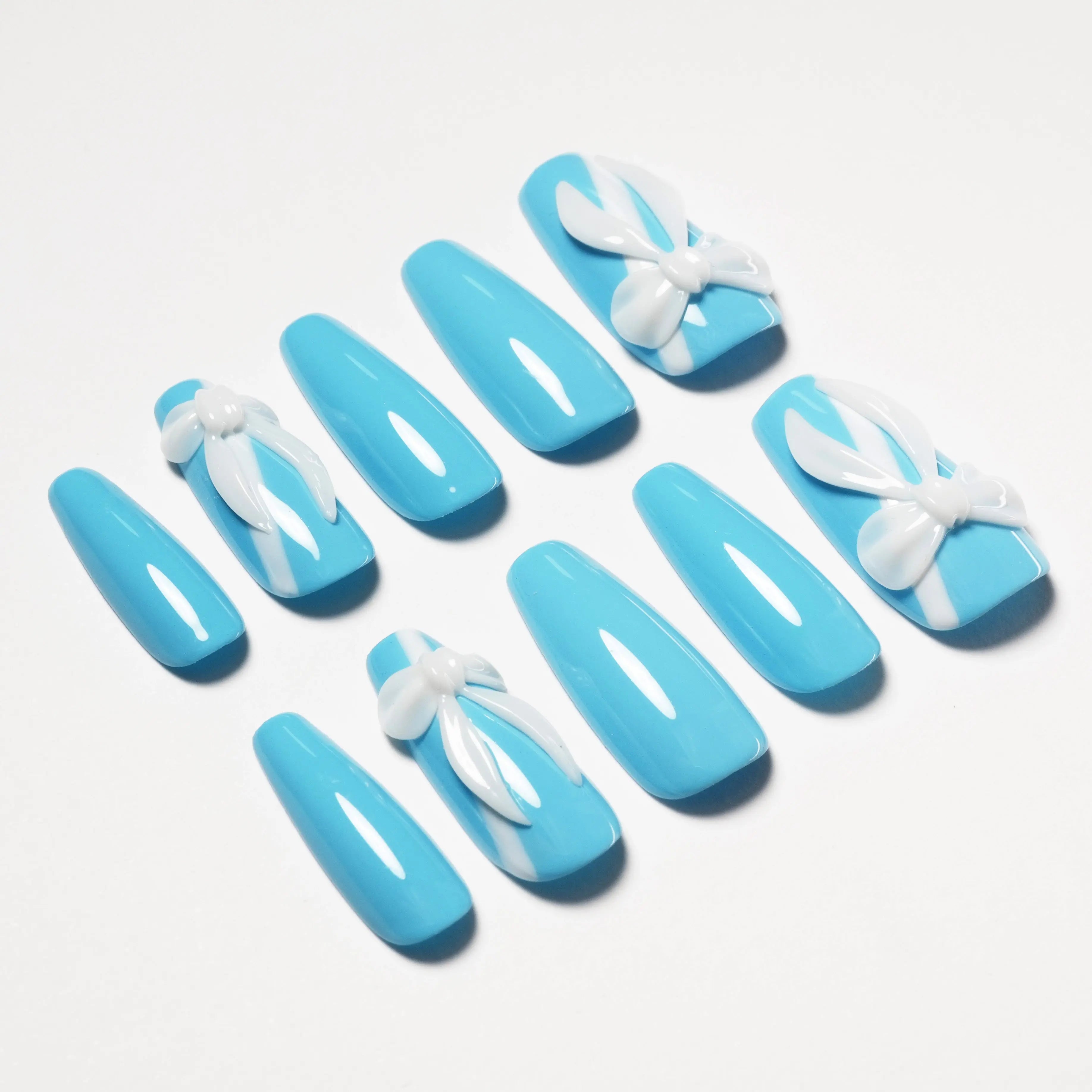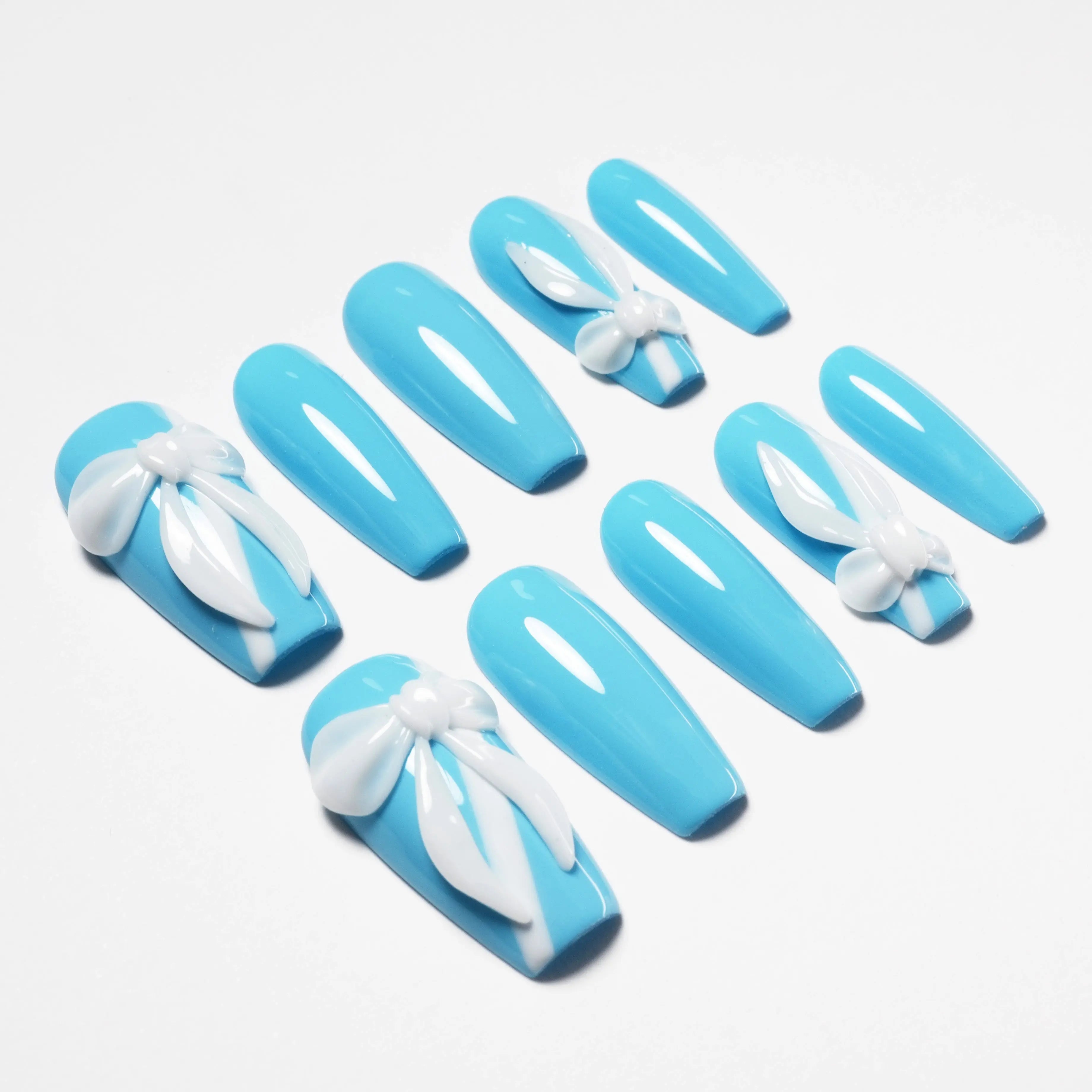 The "Blue Ribbon" press-on nails feature a fresh blue base, adorned with exquisite white bow accents, blending sweetness and playfulness perfectly. The bow design and smooth blue finish complement each other, creating a refreshing and lively vibe, offering a light and elegant visual effect. Perfect for any occasion, showcasing your playful and confident style, ideal for expressing youth and vitality.
