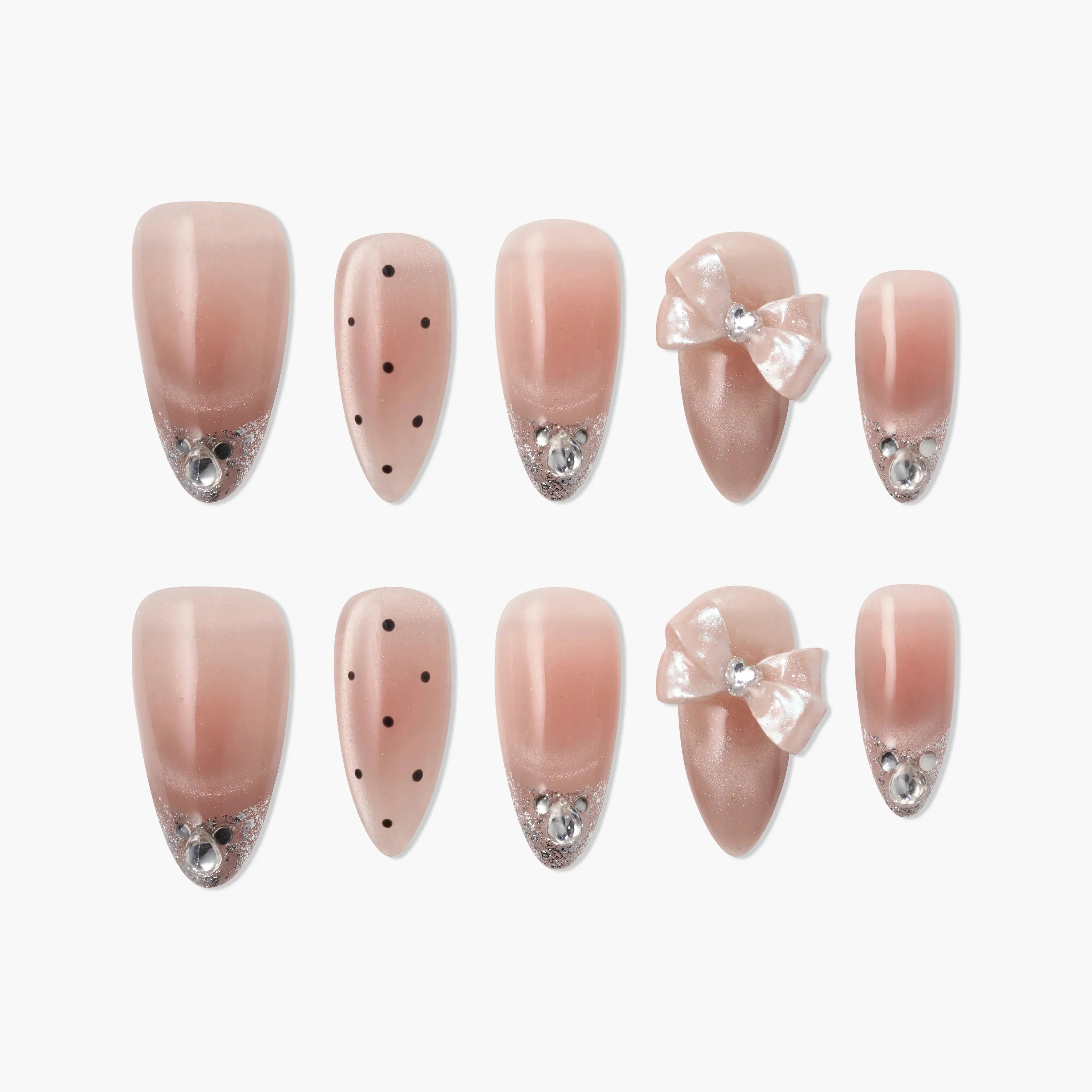 Blush Polka Bow is a handmade press-on nail set designed in a soft nude-pink tone with a gentle satin shimmer. Minimal black polka dots add a playful contrast, while crystal accents at the tips bring a subtle sparkle. The standout bow nail, finished with a glossy translucent sheen, adds a sweet yet elegant focal point without overpowering the look. Balanced between cute and refined, this set is perfect for everyday wear, dates, or soft feminine styling. Ready in 10 minutes and crafted for comfort and durability.