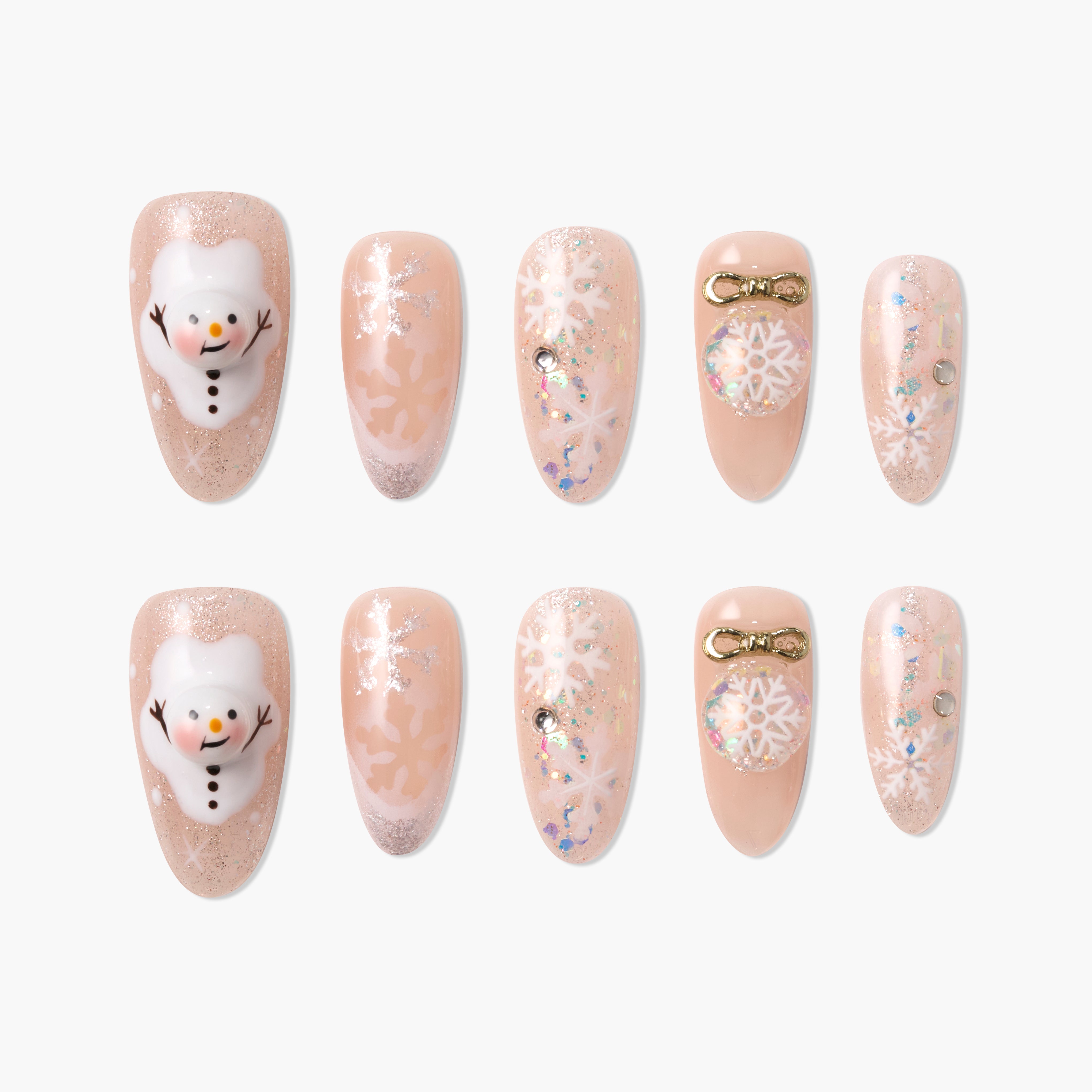 Blush Snowman Whisper is a soft, elegant Christmas press-on nail set inspired by gentle snowfall and warm winter smiles. A peachy nude base with fine shimmer creates a glowing, skin-flattering look, while hand-painted snowflakes and iridescent glitter add a light-catching frost effect. The adorable snowman accent brings a touch of holiday charm, balanced with minimal crystal details and a delicate gold bow for a refined finish. Sweet yet sophisticated, this handmade set is perfect for festive gatherings or everyday winter wear—ready in 10 minutes.