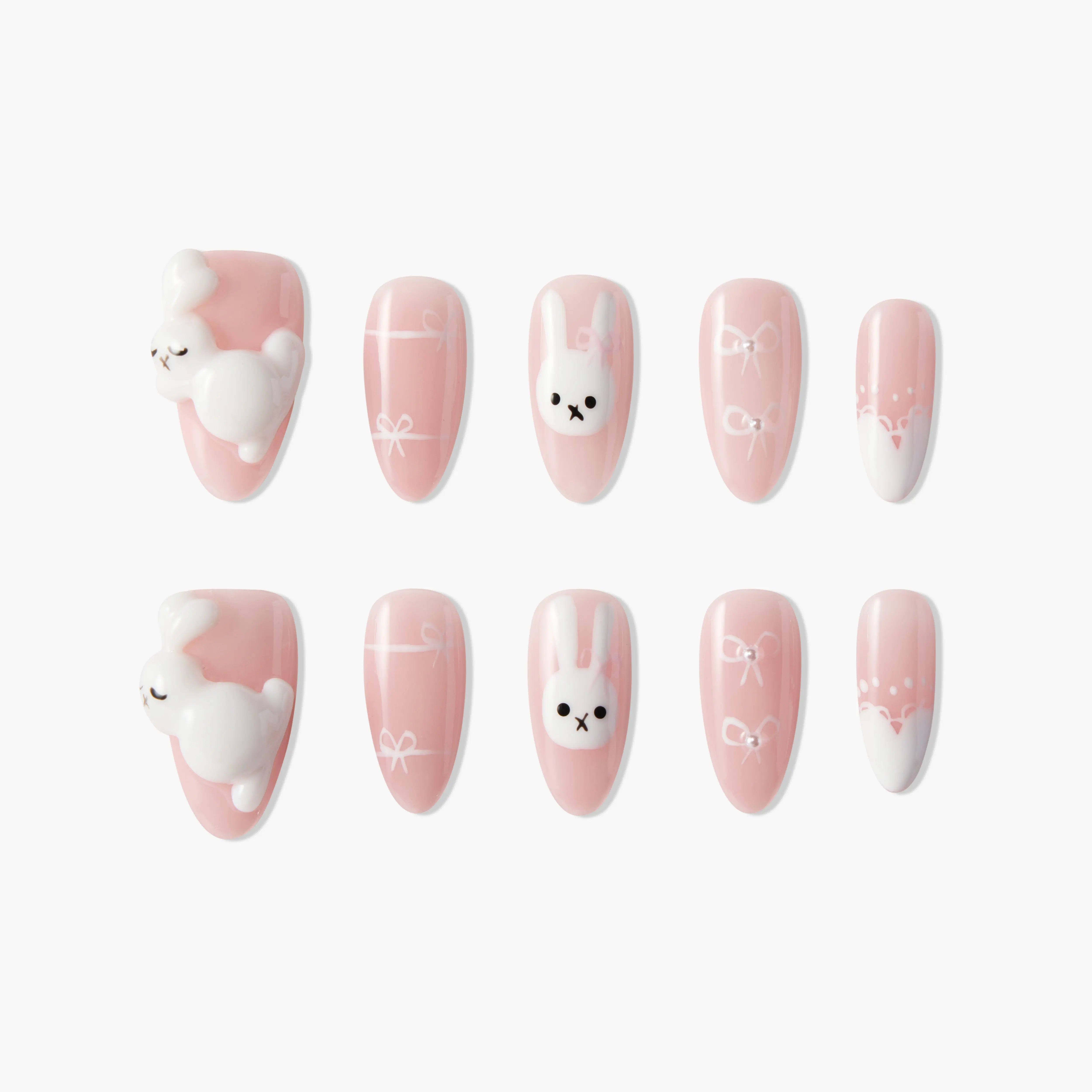 Bunny Wonderland nail series features soft pink tones and cute bunny designs, paired with exquisite bow patterns, creating a dreamy fairy-tale atmosphere. Each bunny design exudes a playful and sweet vibe, as if stepping into a warm bunny kingdom. The detailed bows and elegant white accents enhance the overall delicate and adorable effect.