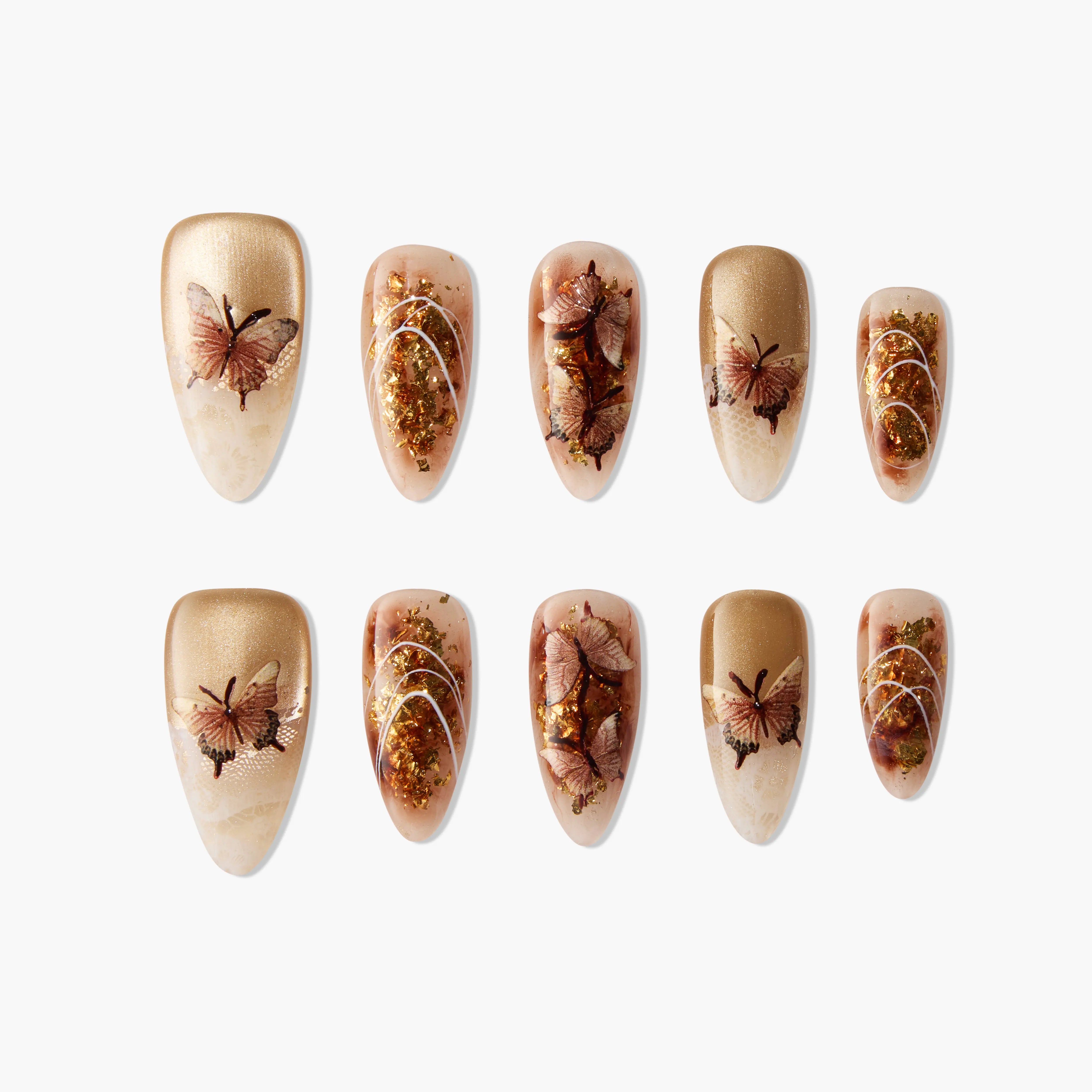Butterfly Gold Flake Dream reusable nails feature beautiful butterfly designs with shimmering gold flakes, creating a natural and elegant vibe. The gold accents and romantic butterfly details add charm to your fingertips. Reusable for convenience, perfect for any graceful occasion.
