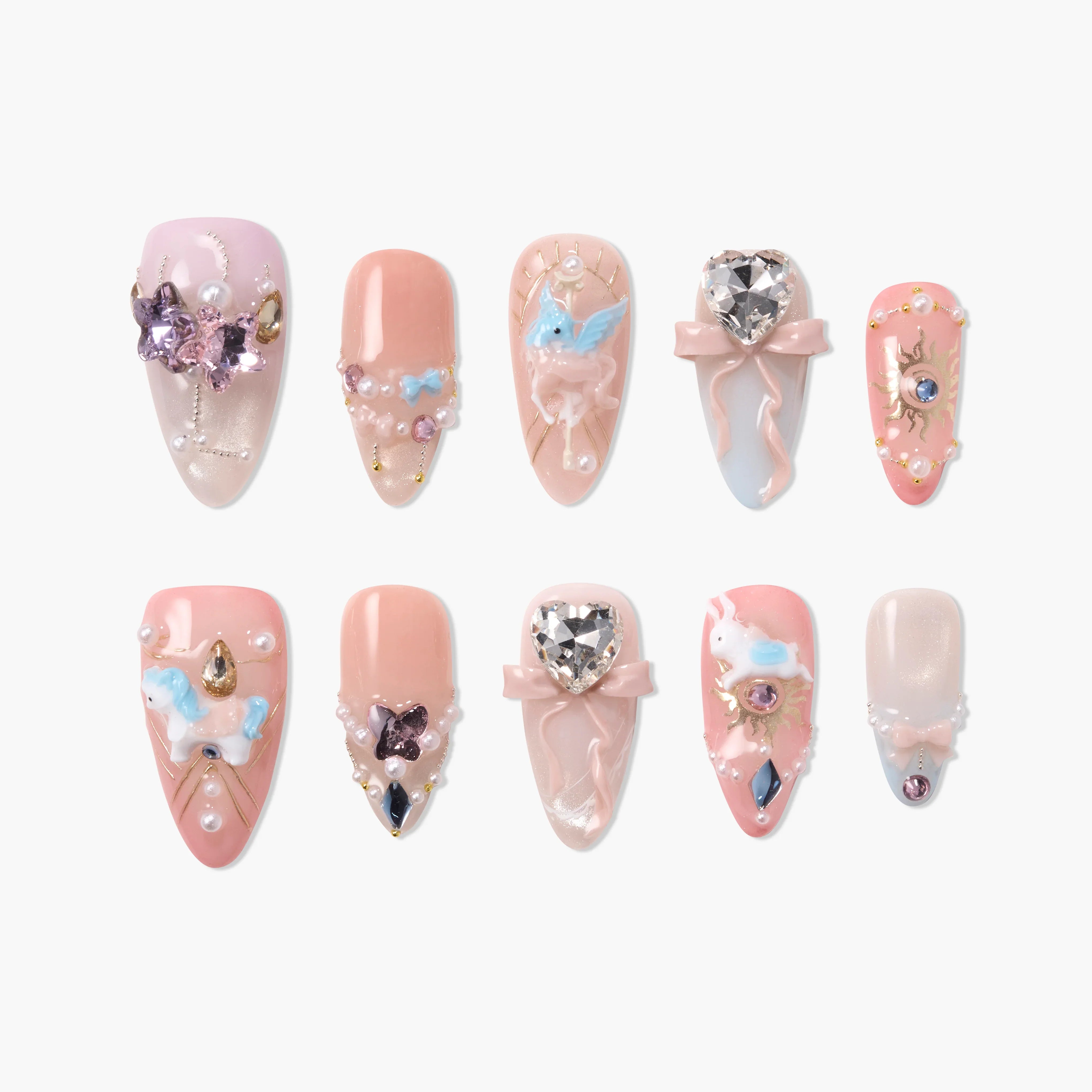 Celestial Carousel is a whimsical, couture fantasy set inspired by fairytale carousels, vintage charms, and celestial magic. Soft blush and lilac tones create a dreamy base, while hand-sculpted ribbon details, carousel horses, pearls, and gold accents add depth and storytelling. Sparkling crystals and ornate embellishments bring a jewelry-like finish, making every nail feel like a miniature collectible piece. Romantic, artistic, and full of character, this handcrafted design is perfect for photoshoots, special occasions, or anyone who loves playful luxury — ready in 10 minutes with a salon-quality shine.