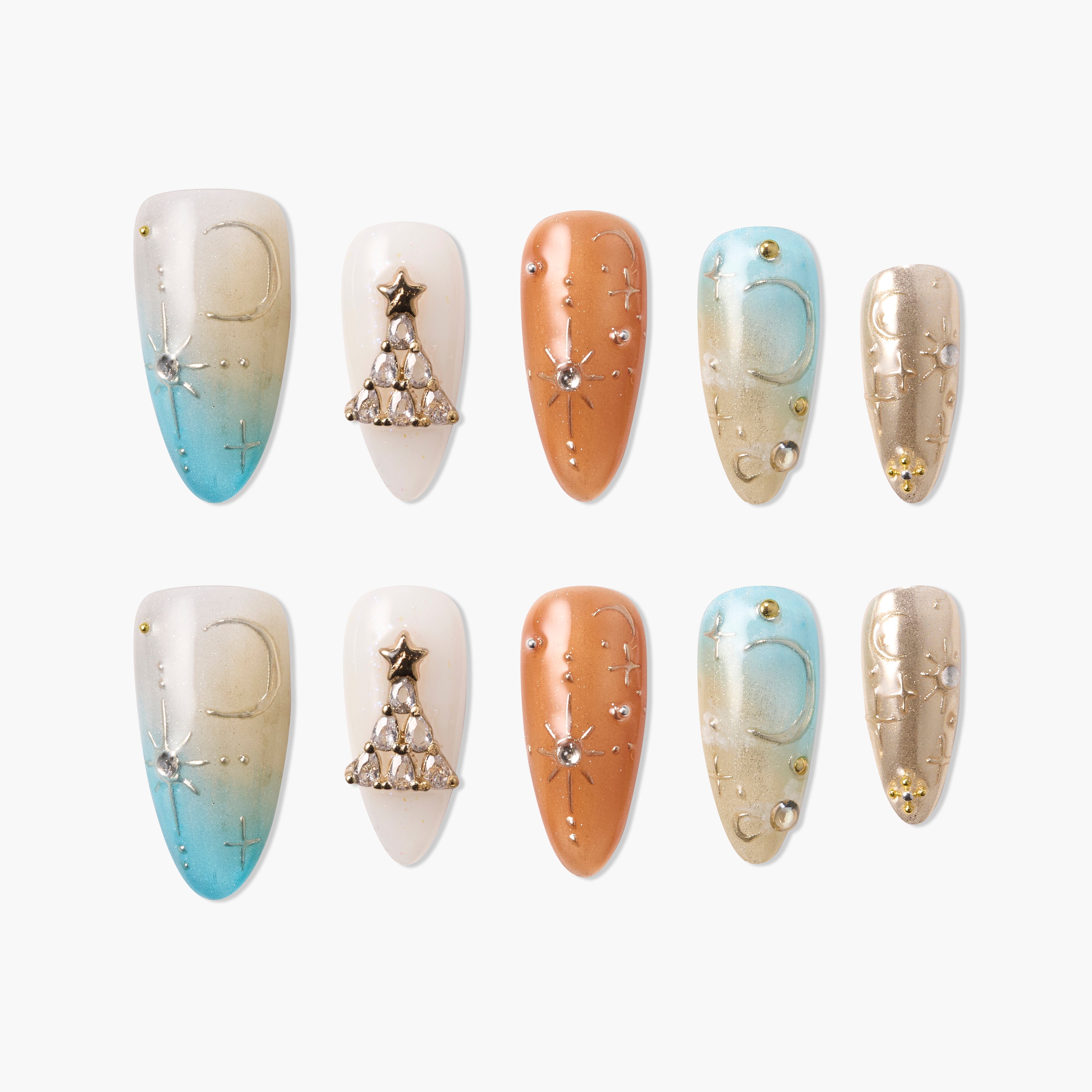 Celestial Noel is a dreamy holiday press-on nail set inspired by winter skies and quiet starlight. Soft gradients of icy blue, warm amber, and champagne gold are layered with delicate celestial details—crescent moons, tiny stars, and constellation-like studs—creating a calm yet luxurious glow. A crystal Christmas tree accent adds a refined festive touch without overpowering the design. Elegant, modern, and subtly magical, this handmade set is perfect for Christmas, winter evenings, or elevated everyday wear—ready in 10 minutes.