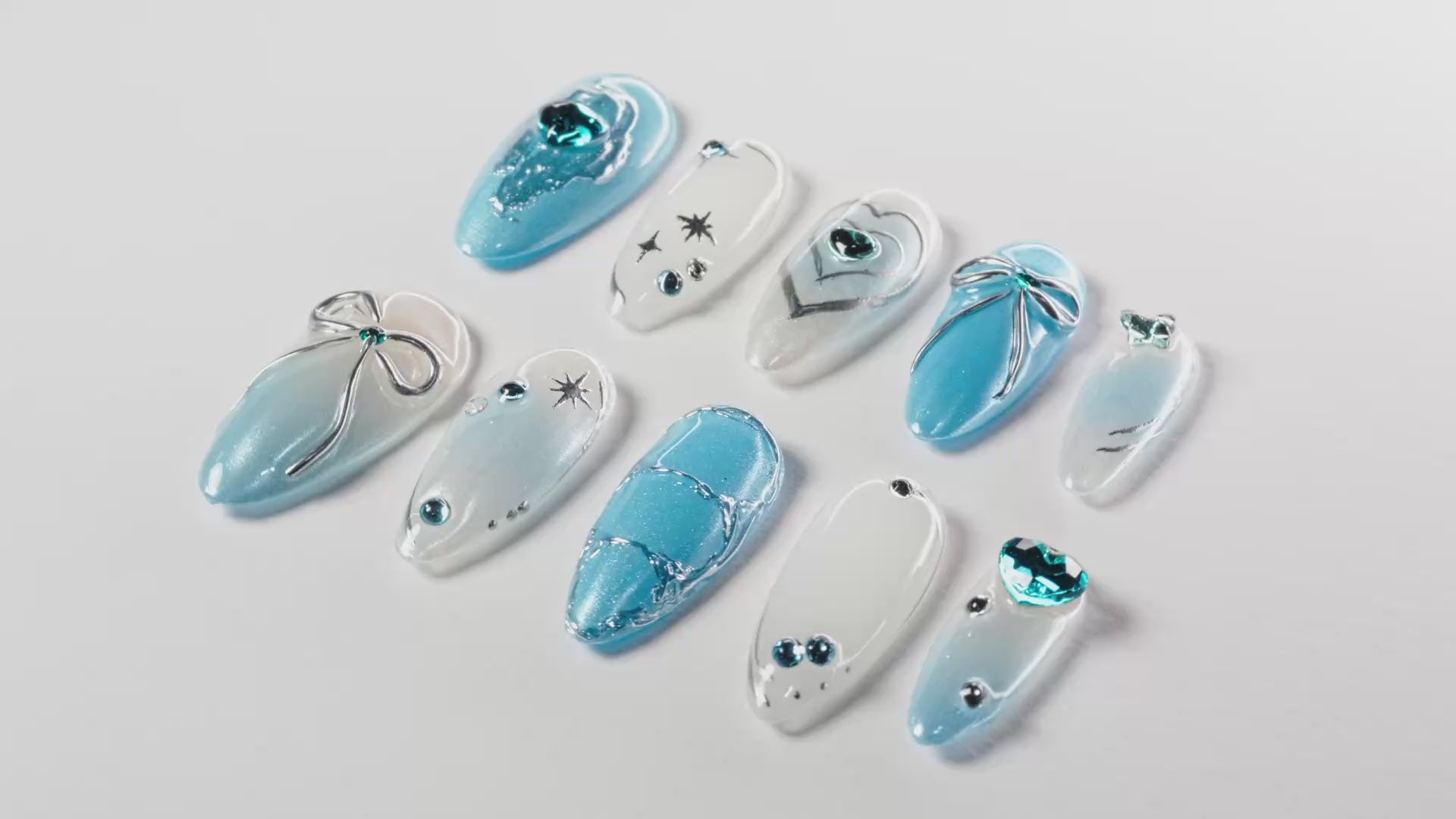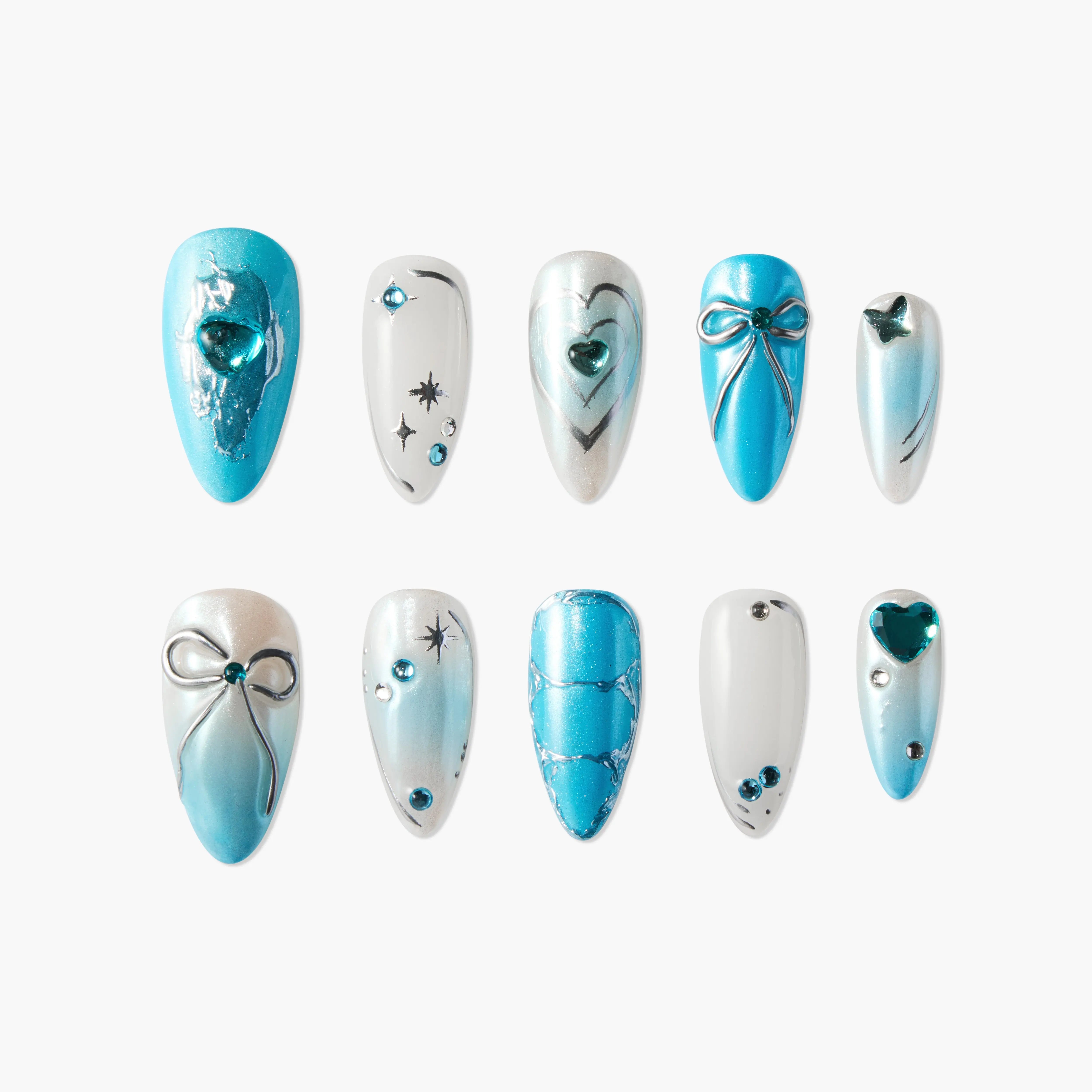 Celestial Ribbons nail art collection combines shimmering blue and silver tones to create a dreamy, ethereal effect. The unique bow and heart accents, along with the embedded gemstones and sleek lines, add a touch of elegance and mystery. The overall design radiates the sparkle of starlight and a romantic aura, resembling ribbons gently floating in the night sky—perfect for women who love refined and romantic styles.