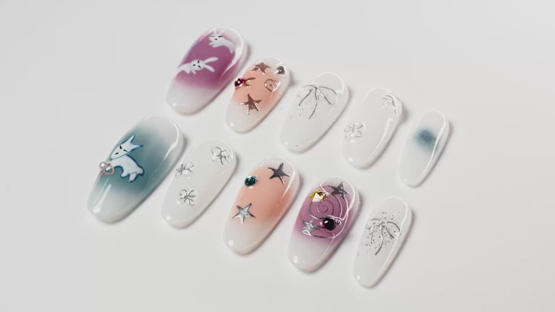 Celestial Wonderland is a nail art collection that blends the mystery of the stars with the dreamy imagery of rabbits, taking you into a world as dazzling as the stars. The design features soft purple and white tones, accented with brilliant stars and delicate bows, while the intricate rabbit images and dreamlike embellishments add a magical touch. Each nail seems to tell a story full of magic and wonder, bringing endless romance and charm to its wearer.