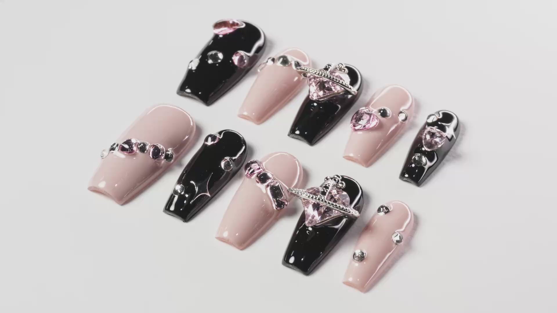 Charming Starry Heart reusable nails feature a perfect combination of black and pink, adorned with heart-shaped crystals, star details, and exquisite jewelry accents, exuding a unique blend of romance and luxury. Perfect for any special occasion, adding charm and sparkle to your fingertips. Reusable for convenience.