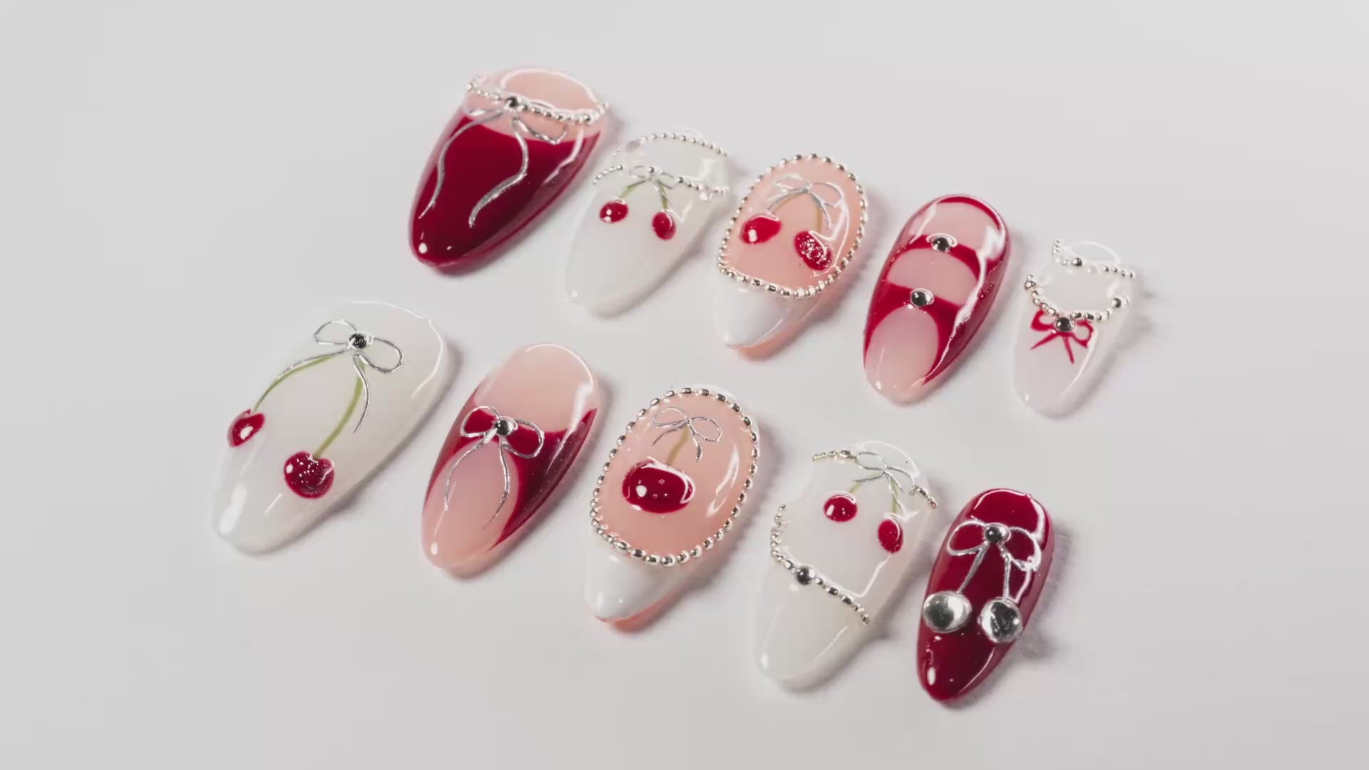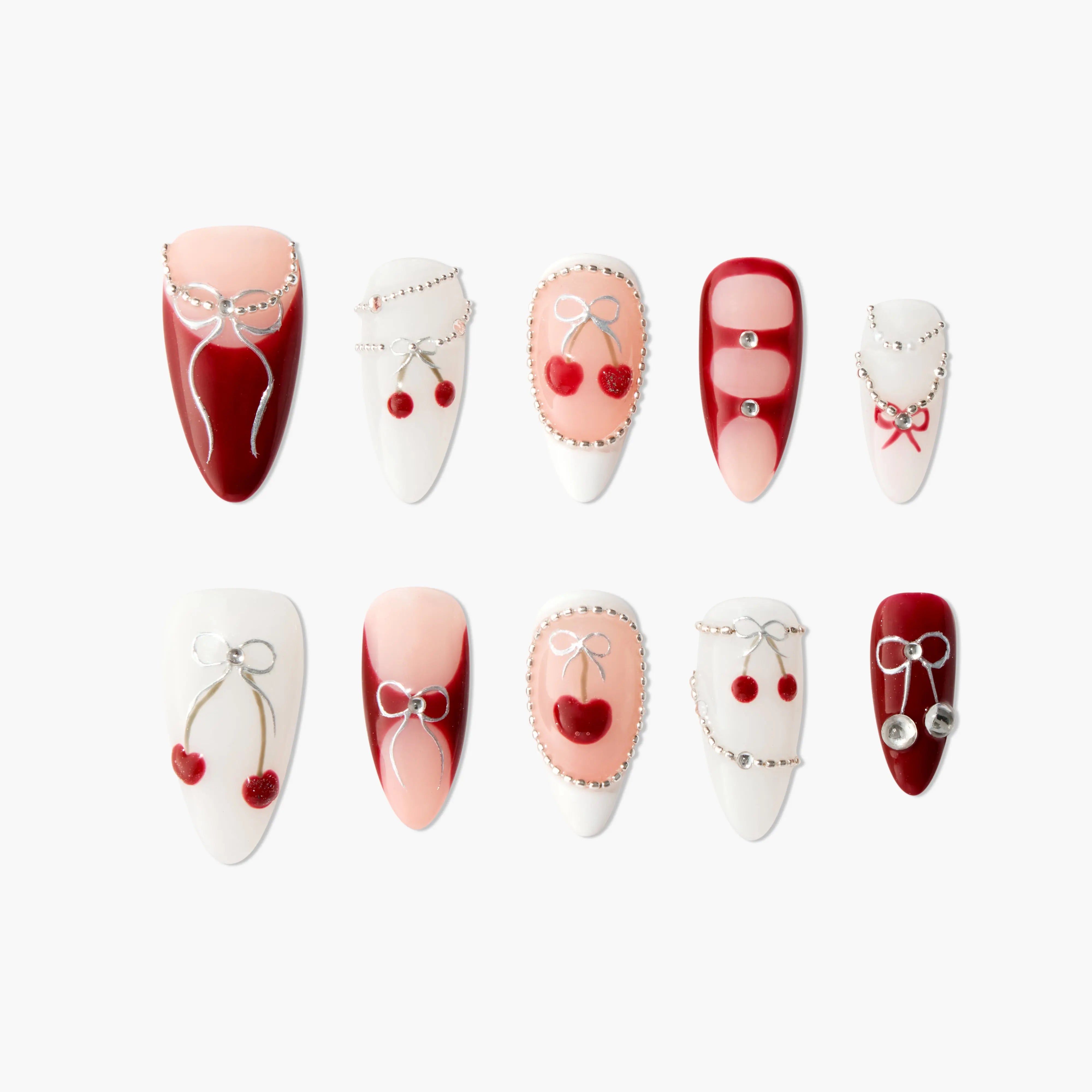 Cherry Love Charm features a red and white theme adorned with cherry elements and delicate silver accents, embodying a playful and sweet aesthetic. The design incorporates 3D bows, charming cherry pendants, and intricate rhinestone frames, adding depth and a whimsical touch. Perfect for dates, parties, or any cheerful occasion, this set brings a dash of adorable romance to your fingertips.