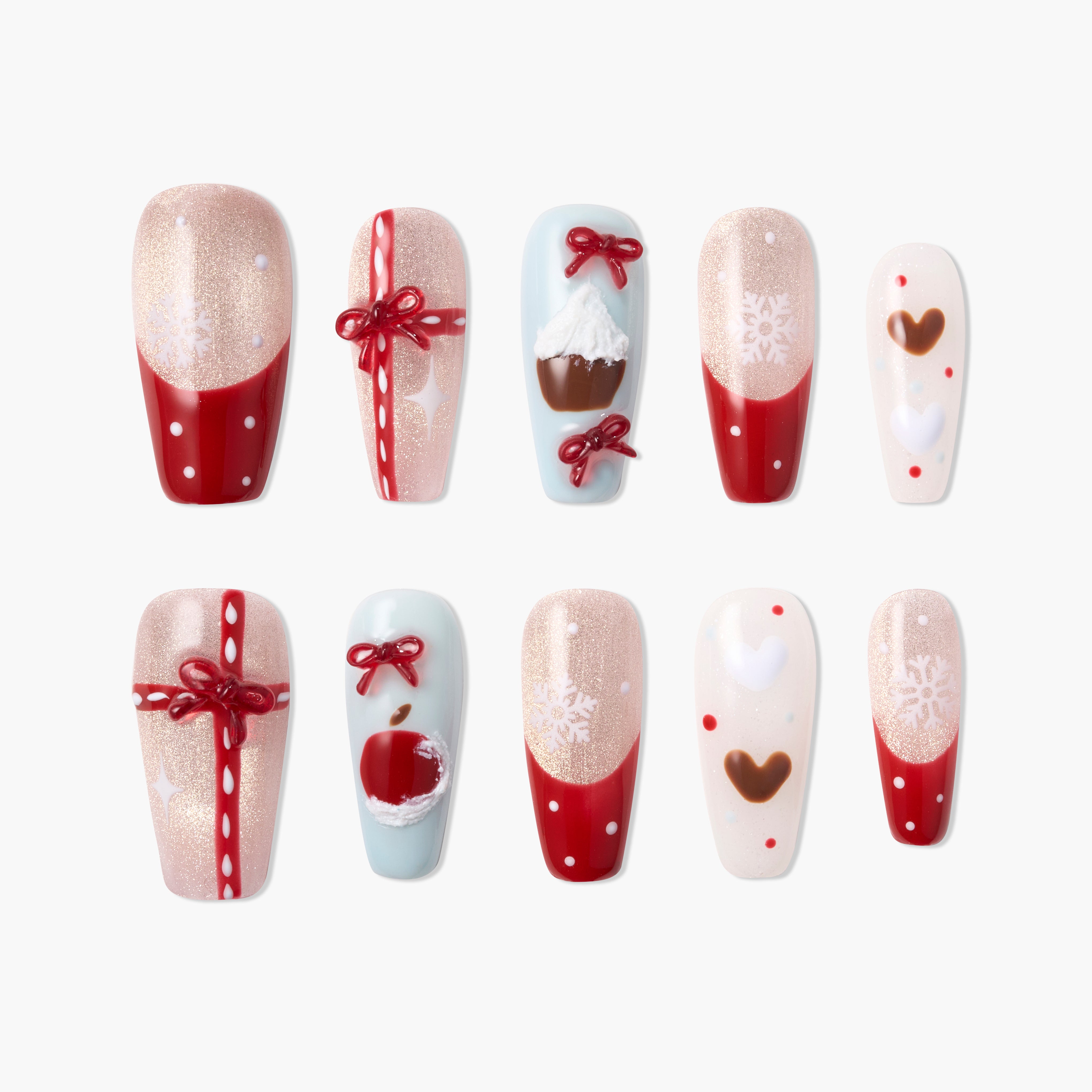Cocoa Gift Noel is a cozy, festive press-on nail set inspired by Christmas treats and wrapped presents. Soft champagne shimmer fades into classic holiday red, accented with snowflake details, candy-like dots, and delicate bow designs that feel warm and joyful. A standout 3D hot cocoa cup and glossy apple motif add a playful dessert-inspired touch without overwhelming the look. Sweet, elegant, and unmistakably festive, this handcrafted set is perfect for Christmas gatherings and winter celebrations—ready in 10 minutes.