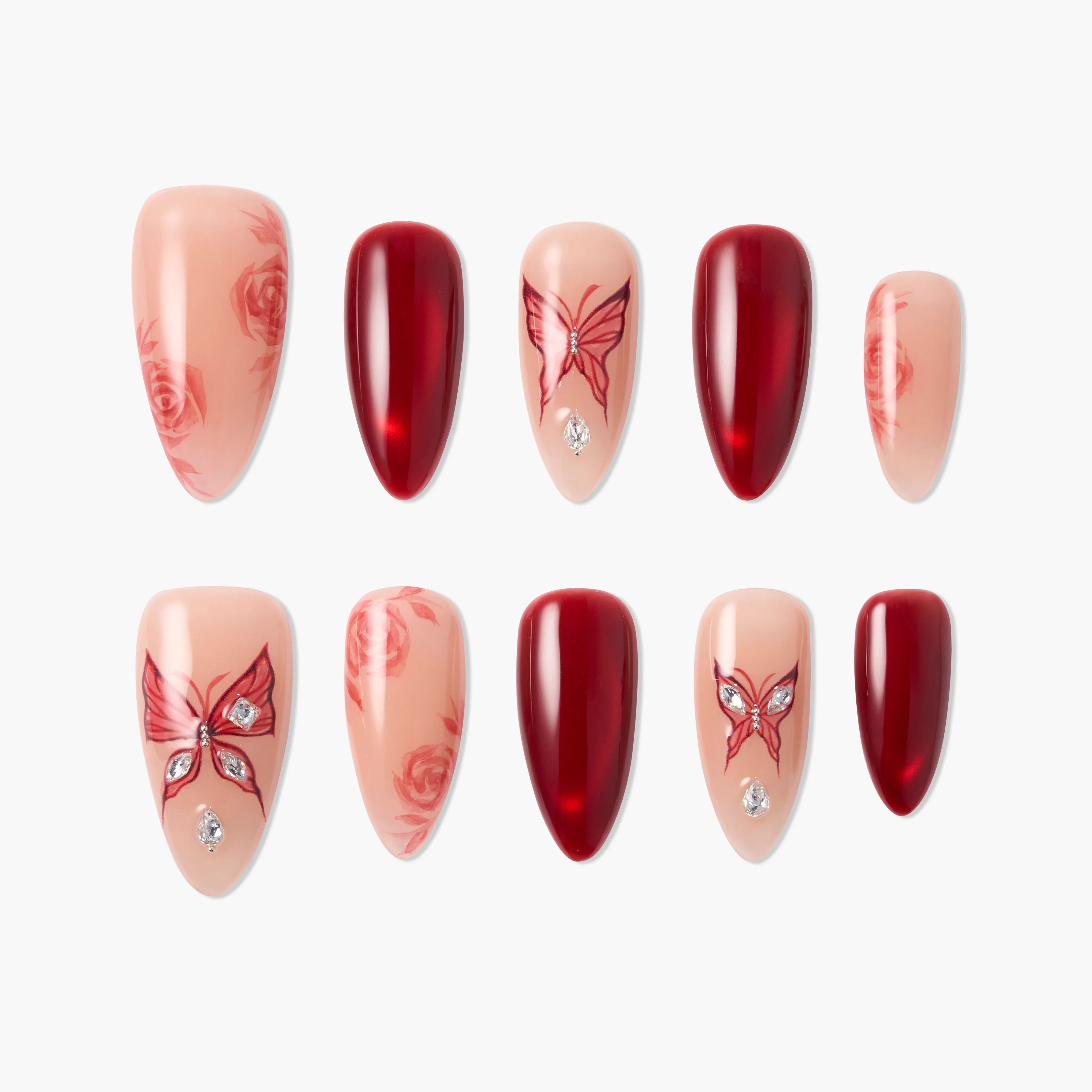 Handmade press on nails by Emily’s Nail, inspired by deep crimson roses and delicate butterfly motifs. Soft nude bases blend with rich red gloss finishes, while hand-painted roses and crystal-accented butterflies add a romantic yet dramatic touch. This design captures elegance and passion in perfect balance, ideal for special occasions or statement looks. Each set is lightweight, reusable, and handcrafted for a salon-quality finish, ready in 10 minutes.