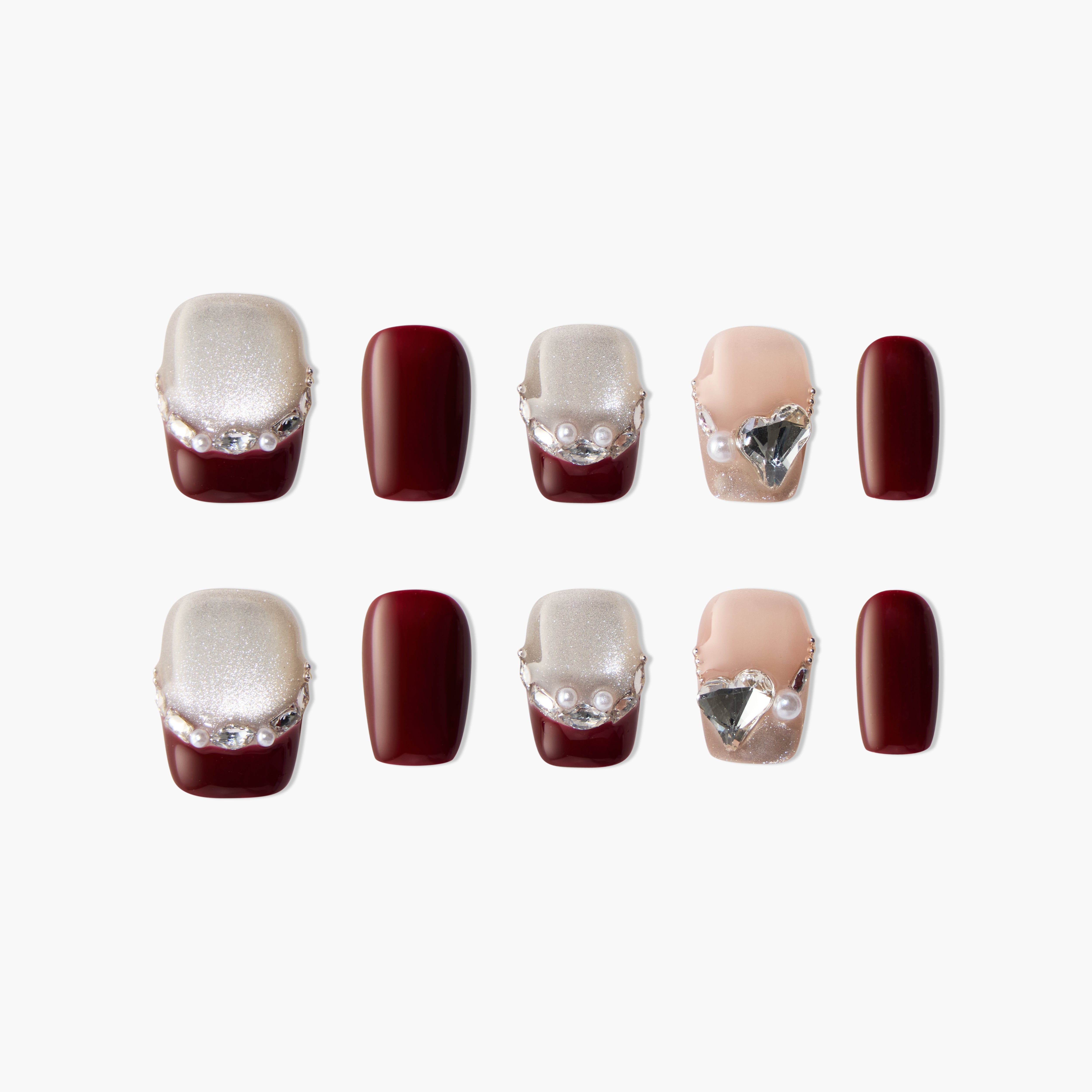 Crystal Heart Pearl reusable nails feature a deep red and transparent gradient design, adorned with exquisite heart-shaped crystals and pearls, creating a luxurious and elegant look. Perfect for formal or special occasions, these nails add a glamorous touch to your fingertips. Reusable for convenience.