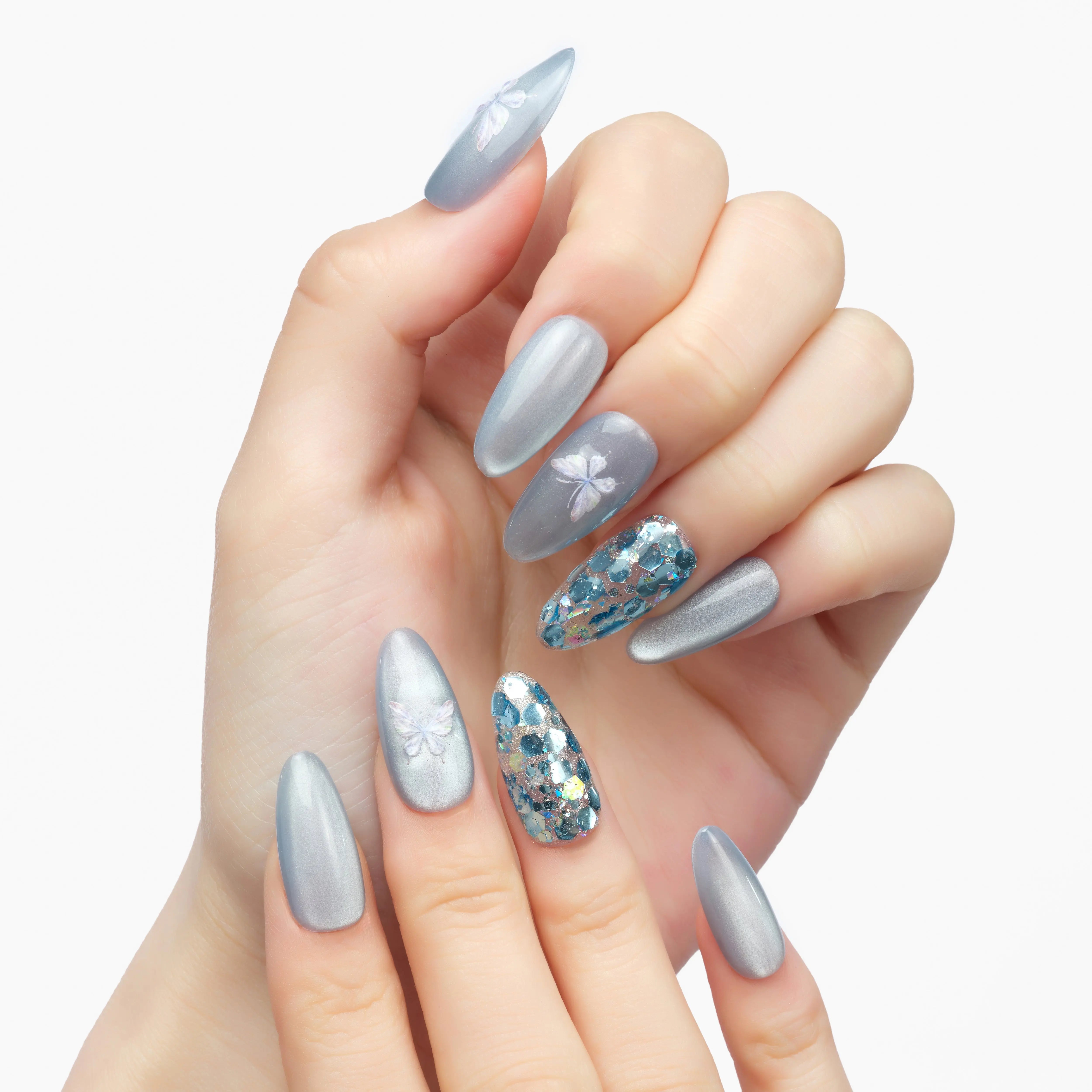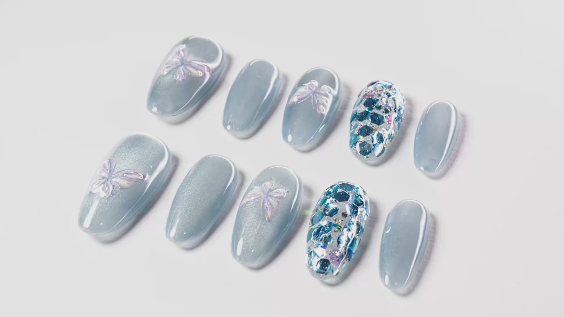 Dancing Butterfly on Ice Press-On Nails: Experience the enchantment of butterflies on ice with an icy blue base, delicate shimmer, and blue holographic sequins. Perfect for winter parties or romantic occasions.