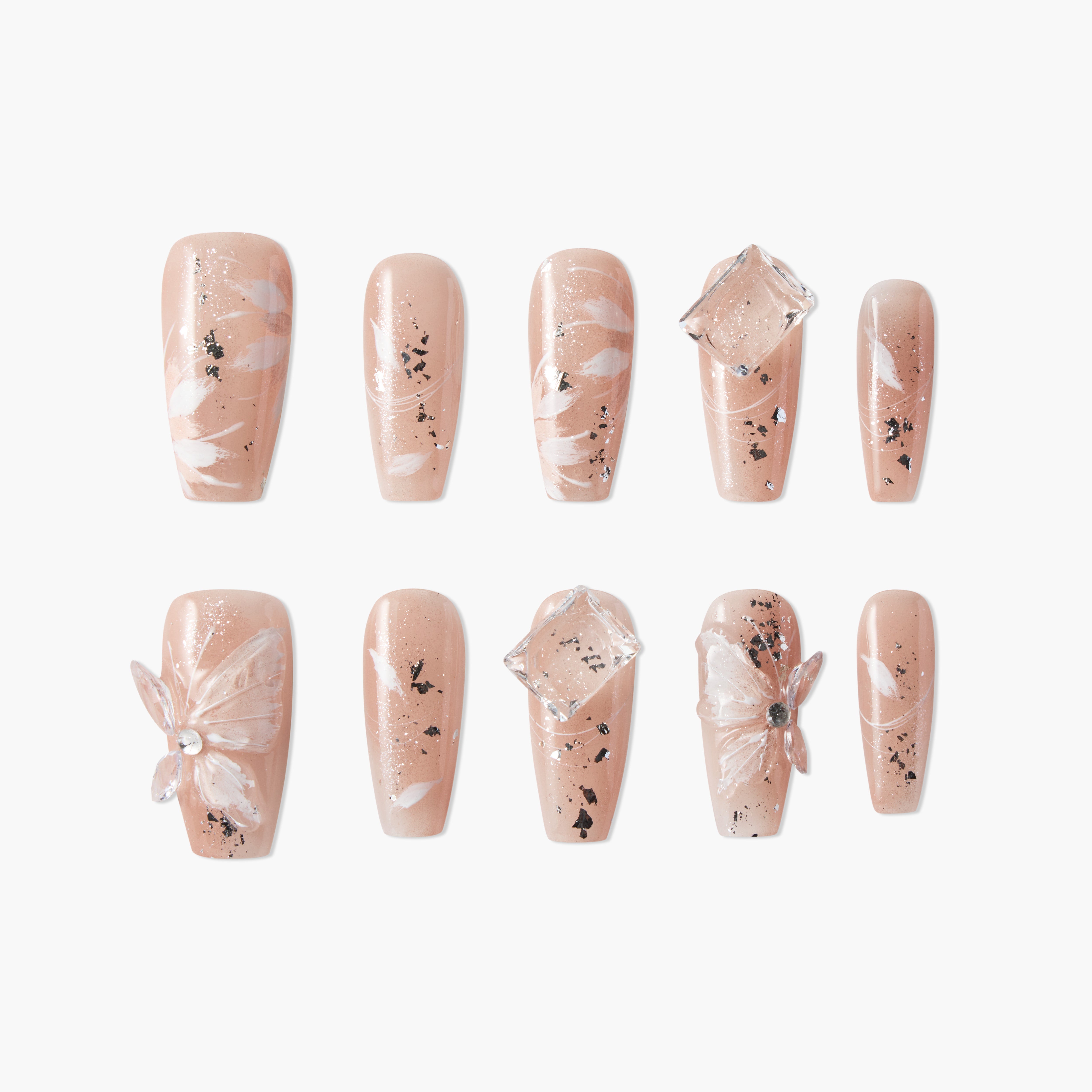 Delicate Elegance nail art collection features a gentle pink base with delicate white feather patterns and shimmering accents, creating a light and elegant atmosphere. The design incorporates unique butterfly elements paired with crystal-clear transparent decorations, evoking the soft texture of falling feathers while also embodying a modern, refined beauty, leaving an impression of softness with a touch of luxury.