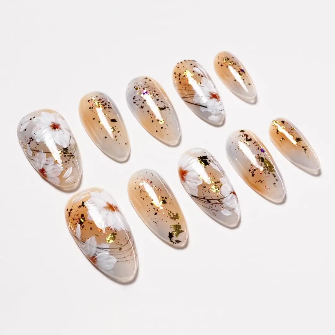 The "Dreamy Blossom" press-on nails combine soft nude tones with delicate floral patterns, featuring intricate white flowers and golden glitter that create a romantic and elegant vibe. The floral designs intertwined with golden flecks evoke a dreamy, garden-like feel. Whether for daily wear or special occasions, these nails add a touch of romance and luxury to your finge