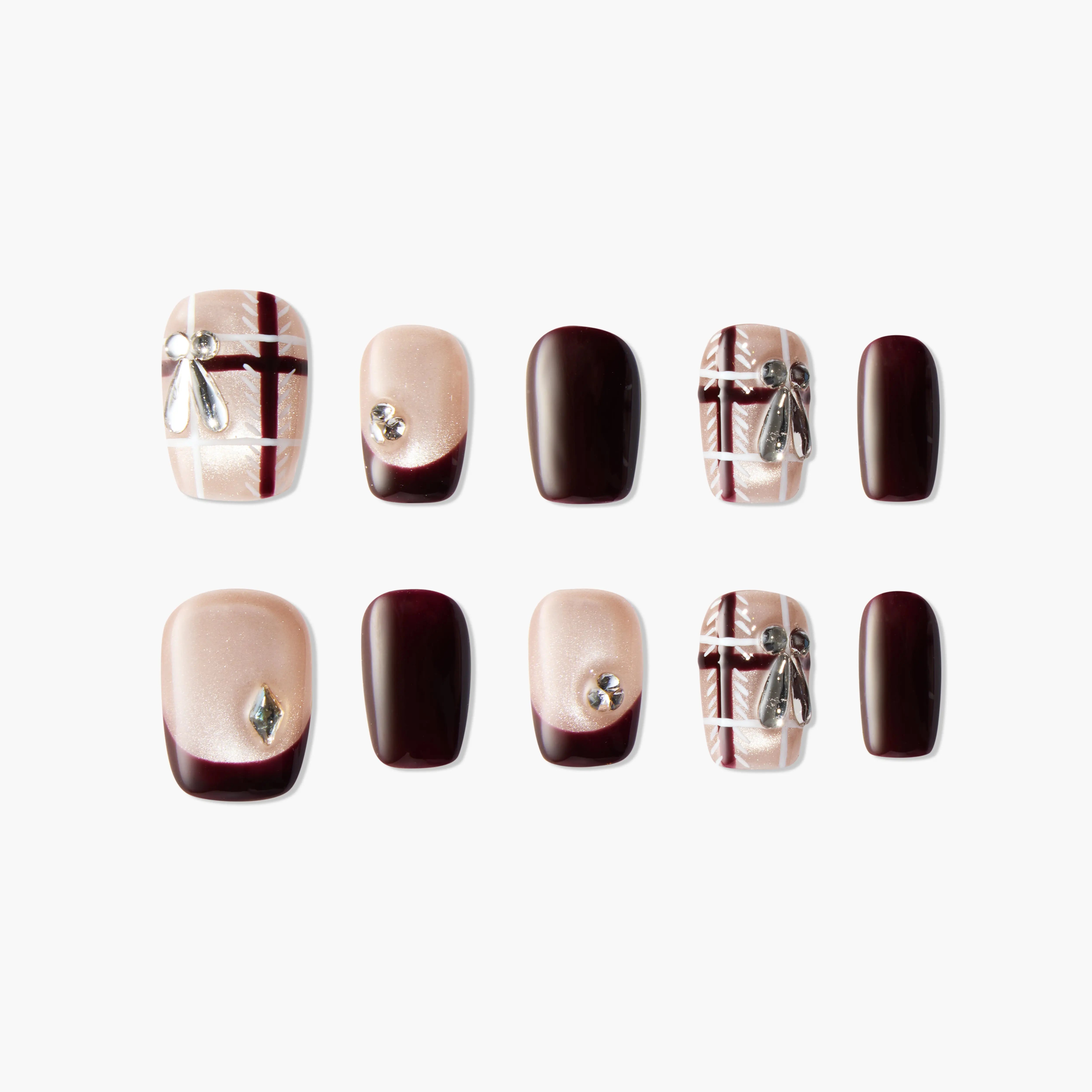Elegant Plaid press-on nails feature a combination of soft nude pink and deep purple with delicate plaid patterns and dazzling rhinestone accents. It exudes a refined and elegant vibe, perfect for formal occasions or daily wear when you want to showcase sophistication.