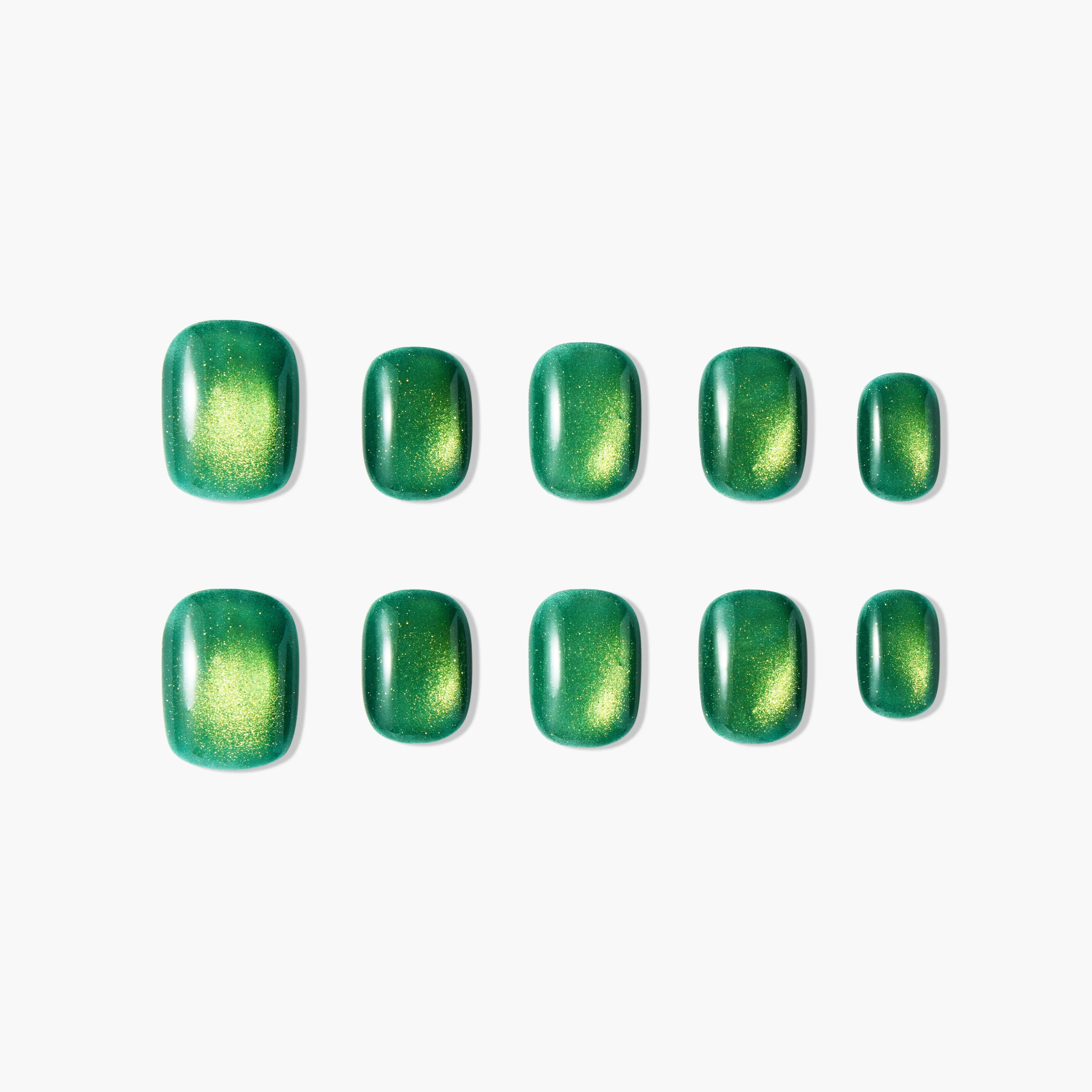 Emerald Glow design is inspired by the deep green hues of emerald gemstones and the natural glow of light. Each fingertip captures the essence of nature with a rich green base, glowing with subtle hints of light, much like the gleaming leaves in the forest under sunlight. The gradient effect and the golden specks bring warmth and a vibrant aura to the design, exuding a sense of natural purity and beauty. This simple yet elegant design is perfect for women who enjoy understated luxury with a touch of nature.