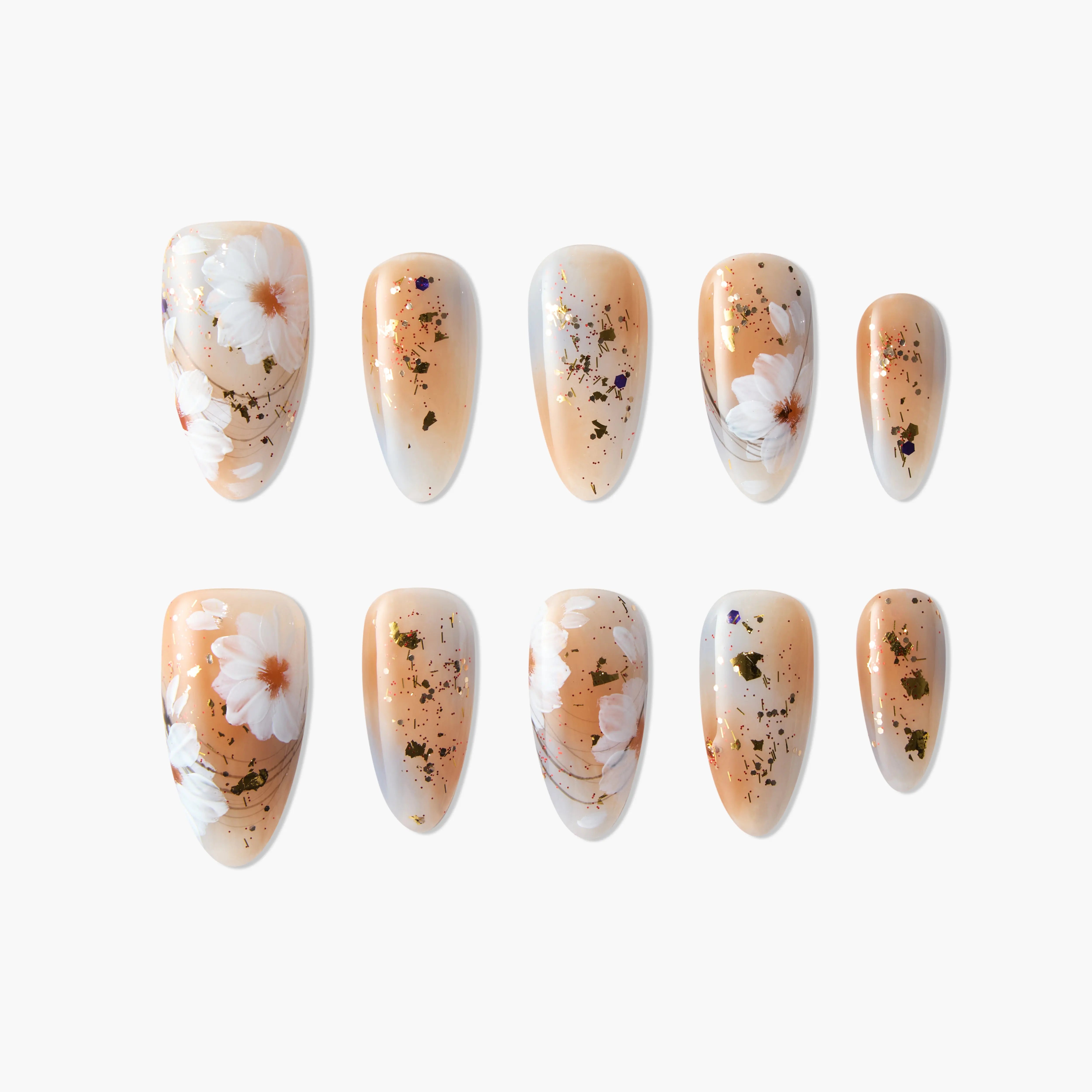 These Floral Dawn press-on nails feature a warm light orange base with delicate white floral designs and intricate gold flakes. The addition of small gold and purple accents adds a subtle sparkle, reminiscent of flowers in the dawn light. The gentle and elegant design adds a unique natural beauty, perfect for both everyday wear and special occasions.