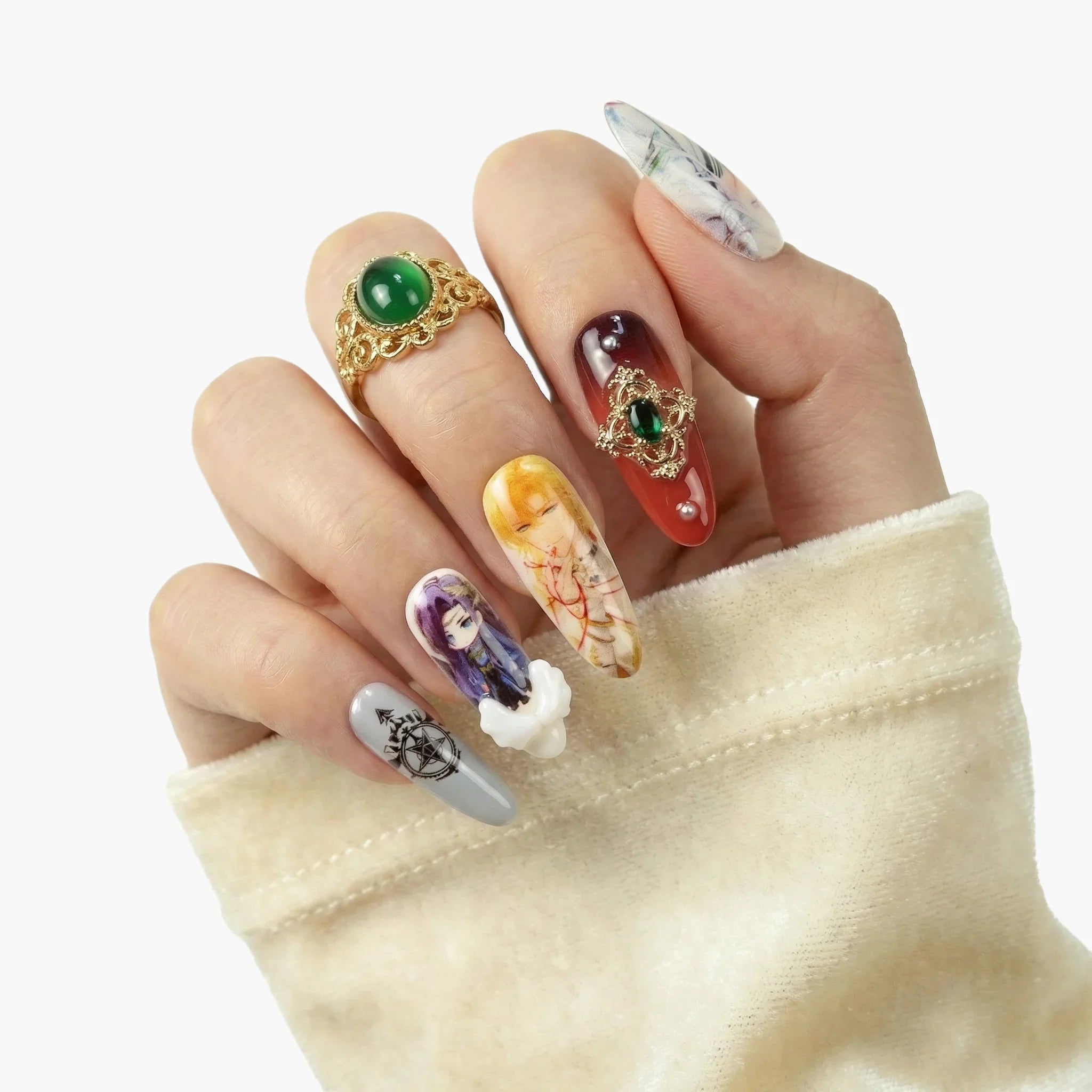 Handmade press-on nails featuring For All Time-inspired designs—salon-quality and ready in 10 minutes.