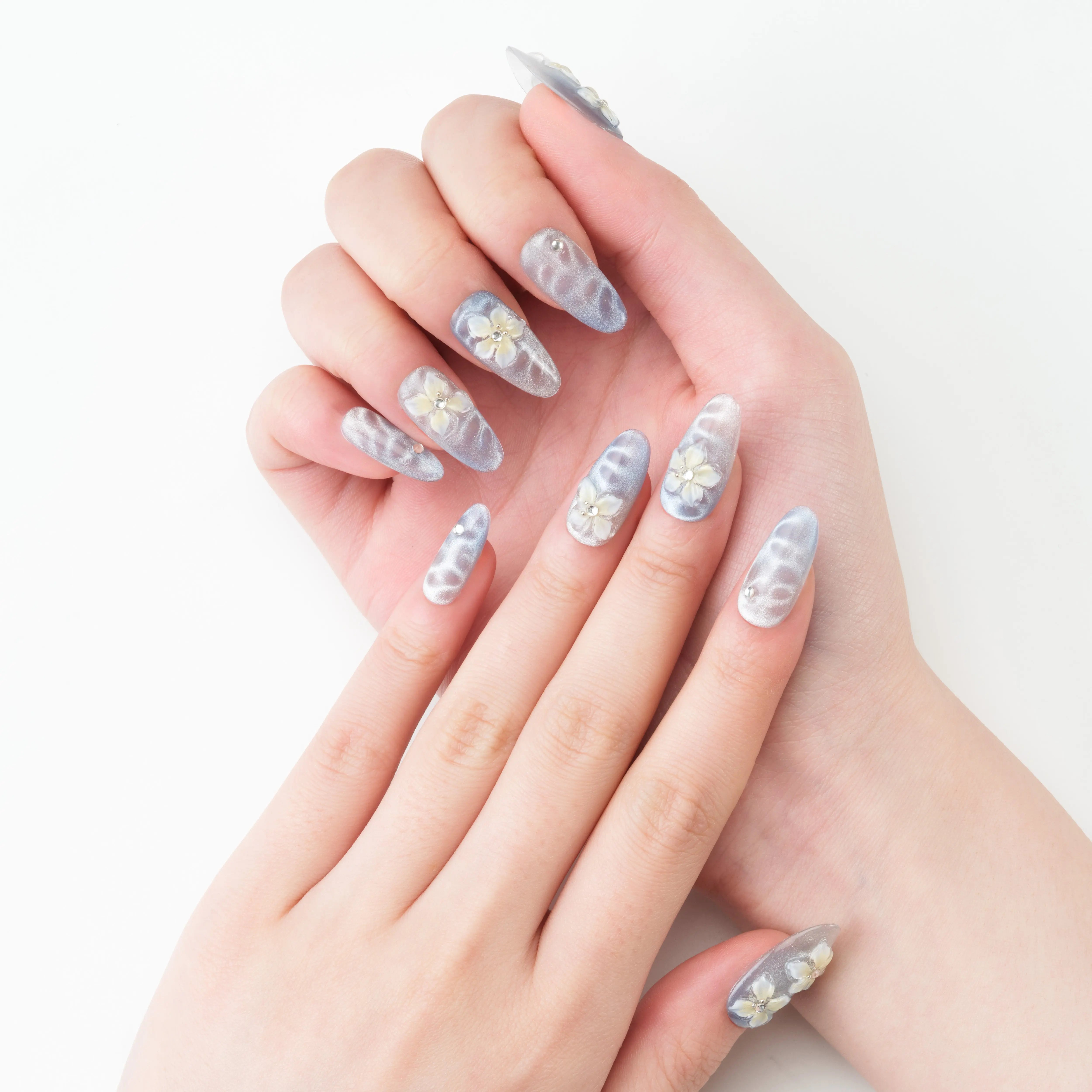 Frosted Bloom nail set is an enchanting blend of icy blue and silver shimmer, evoking a serene winter's day. The design features delicate three-dimensional floral accents in soft cream tones, adorned with sparkling rhinestones at their center, adding an air of elegance and sophistication. The subtle swirling patterns across the nails mimic frost patterns, creating a magical, dreamy look. Perfect for winter occasions or anyone seeking a gentle yet glamorous nail style.