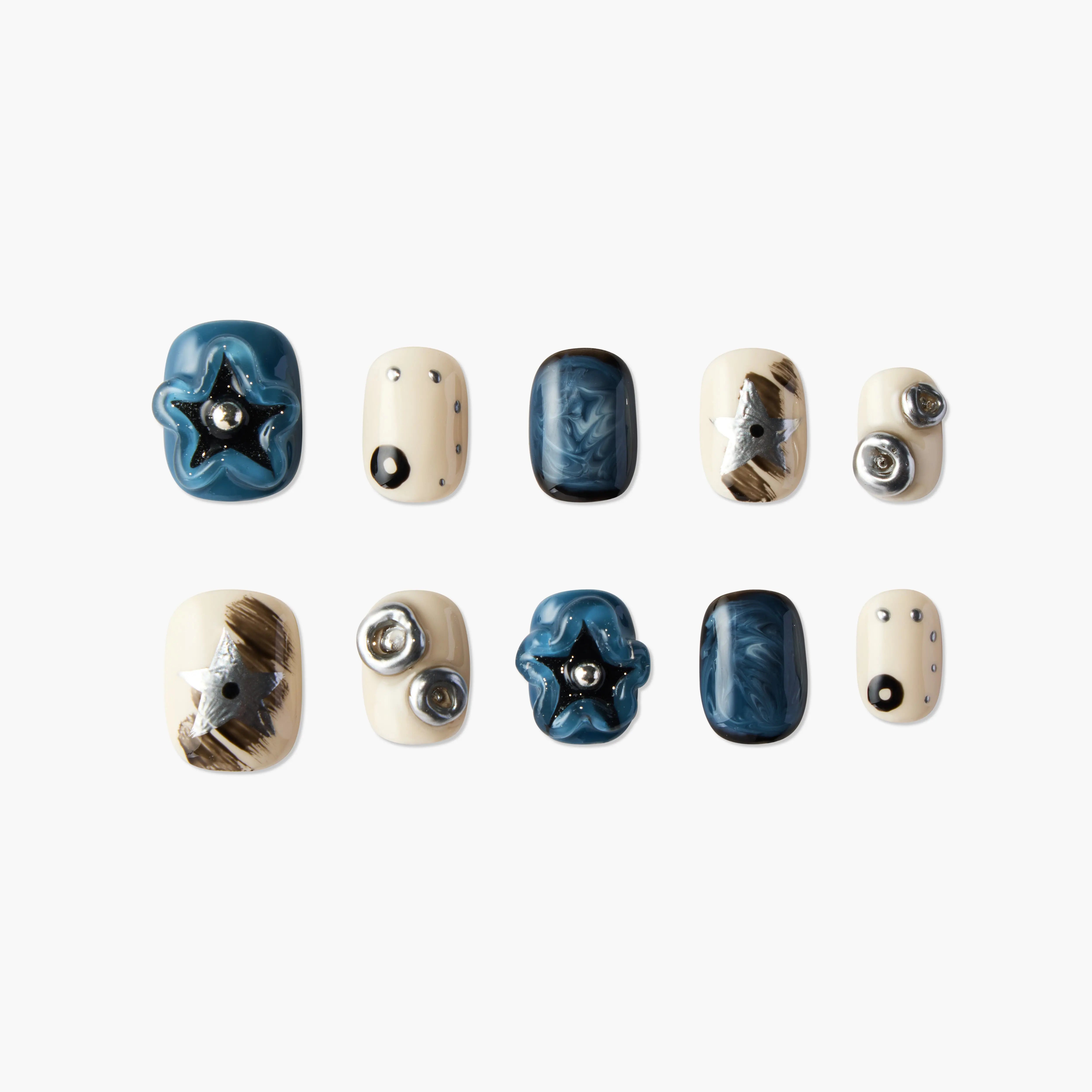 Galactic Adventure features a base of deep blue and creamy white, with 3D stars, metallic accents, and swirling nebula patterns that create a mysterious space vibe. The star elements and silver details resemble stars in the night sky, adding a cosmic depth to the design. Perfect for those who love a futuristic and unique style, this nail set is ideal for both everyday wear and parties, letting your fingertips shine with an out-of-this-world allure.