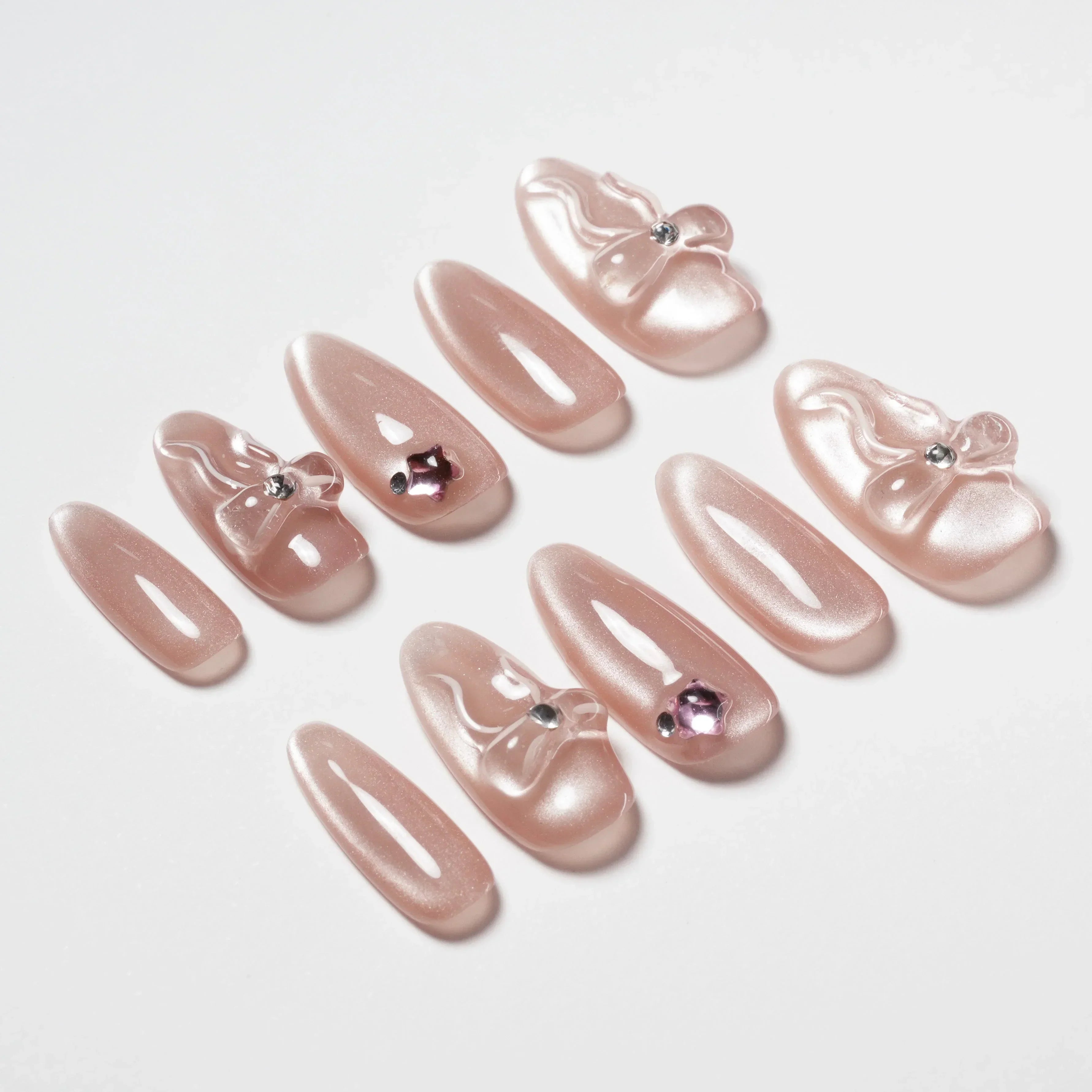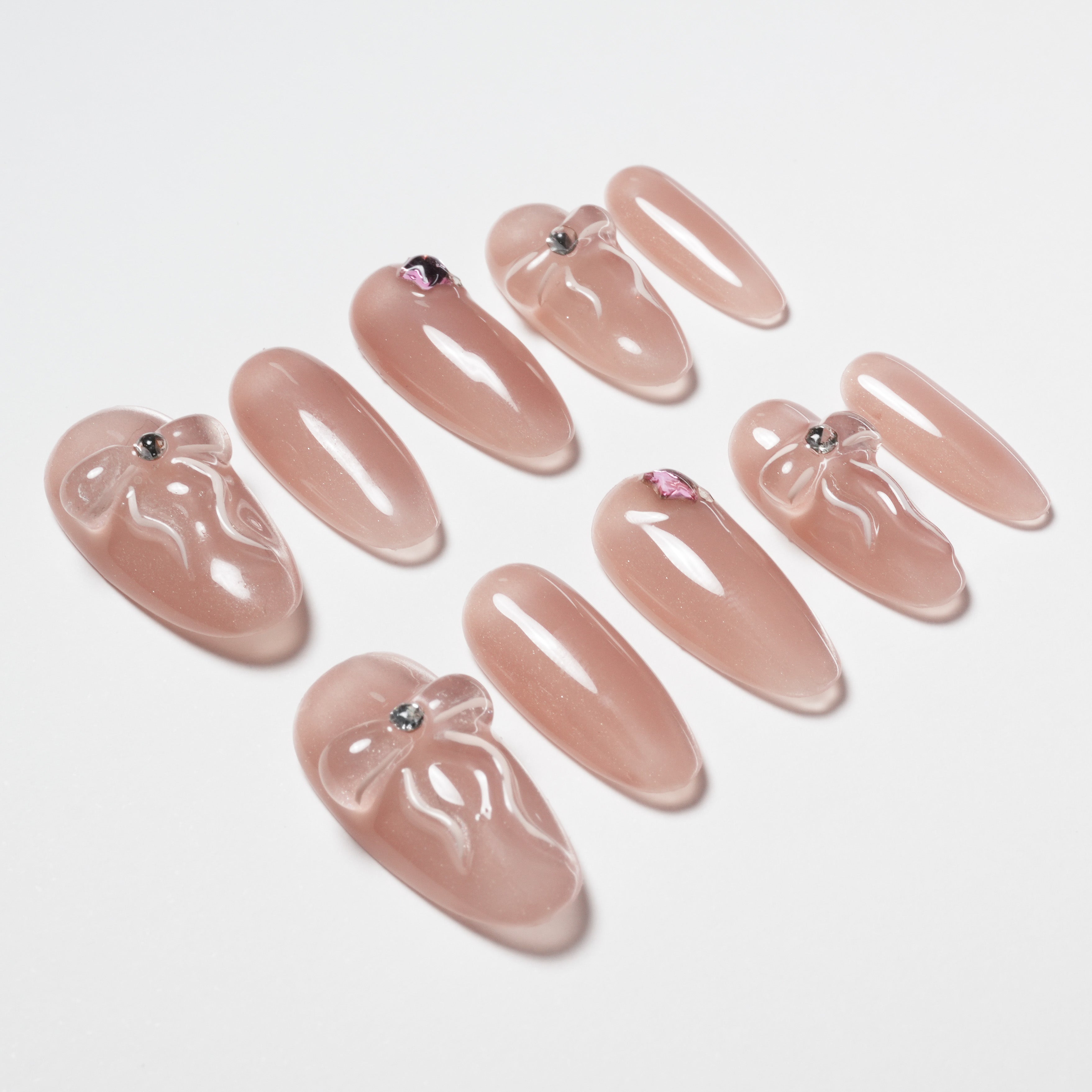 The "Glowing Dance" press-on nails feature a soft nude base, adorned with exquisite crystals and graceful flowing designs, showcasing a romantic and delicate aura. The fluid design and sparkling crystal accents on each nail make your fingertips shimmer like dancing light, highlighting both elegance and motion. Simple yet sophisticated, perfect for any occasion, emphasizing intricate charm and feminine grace.