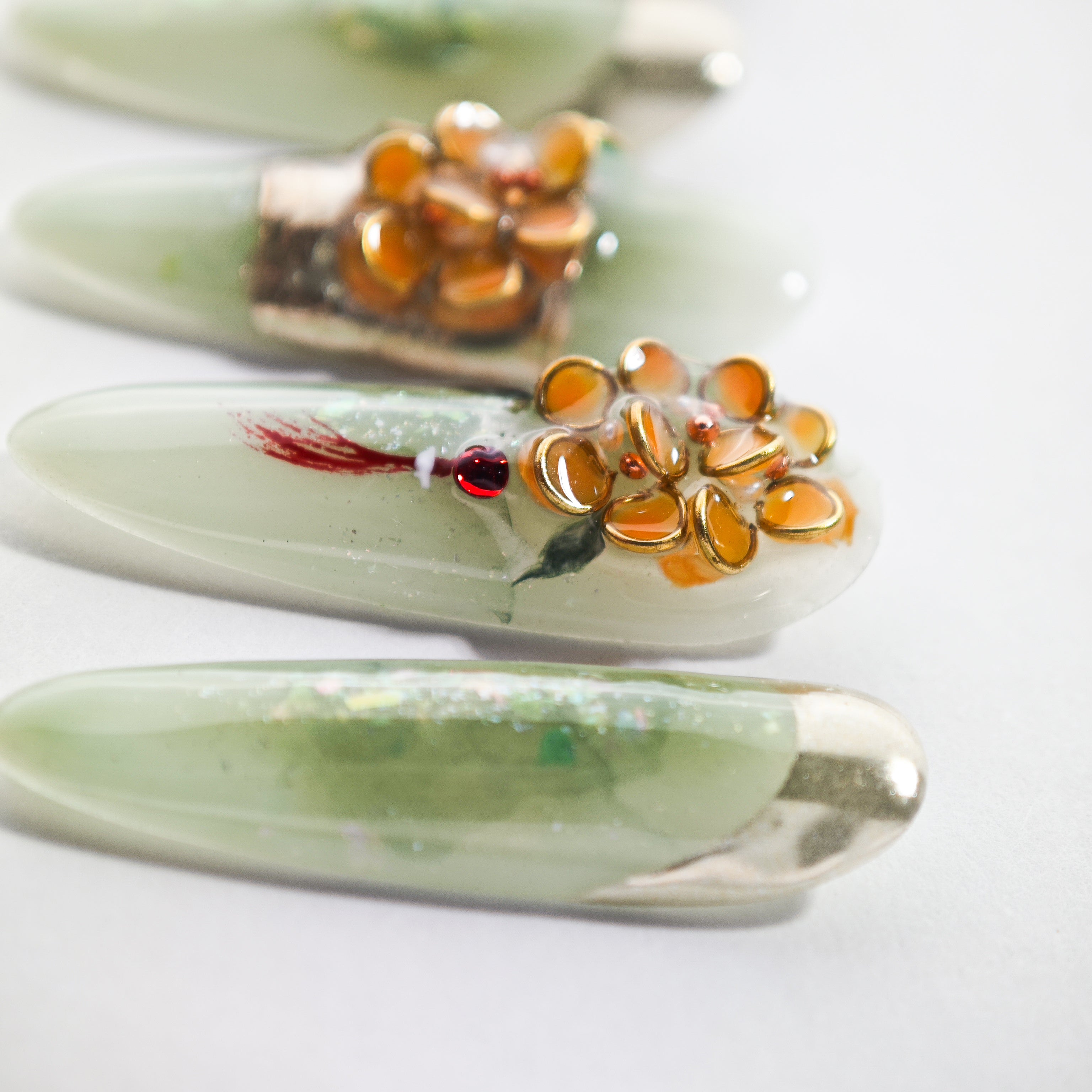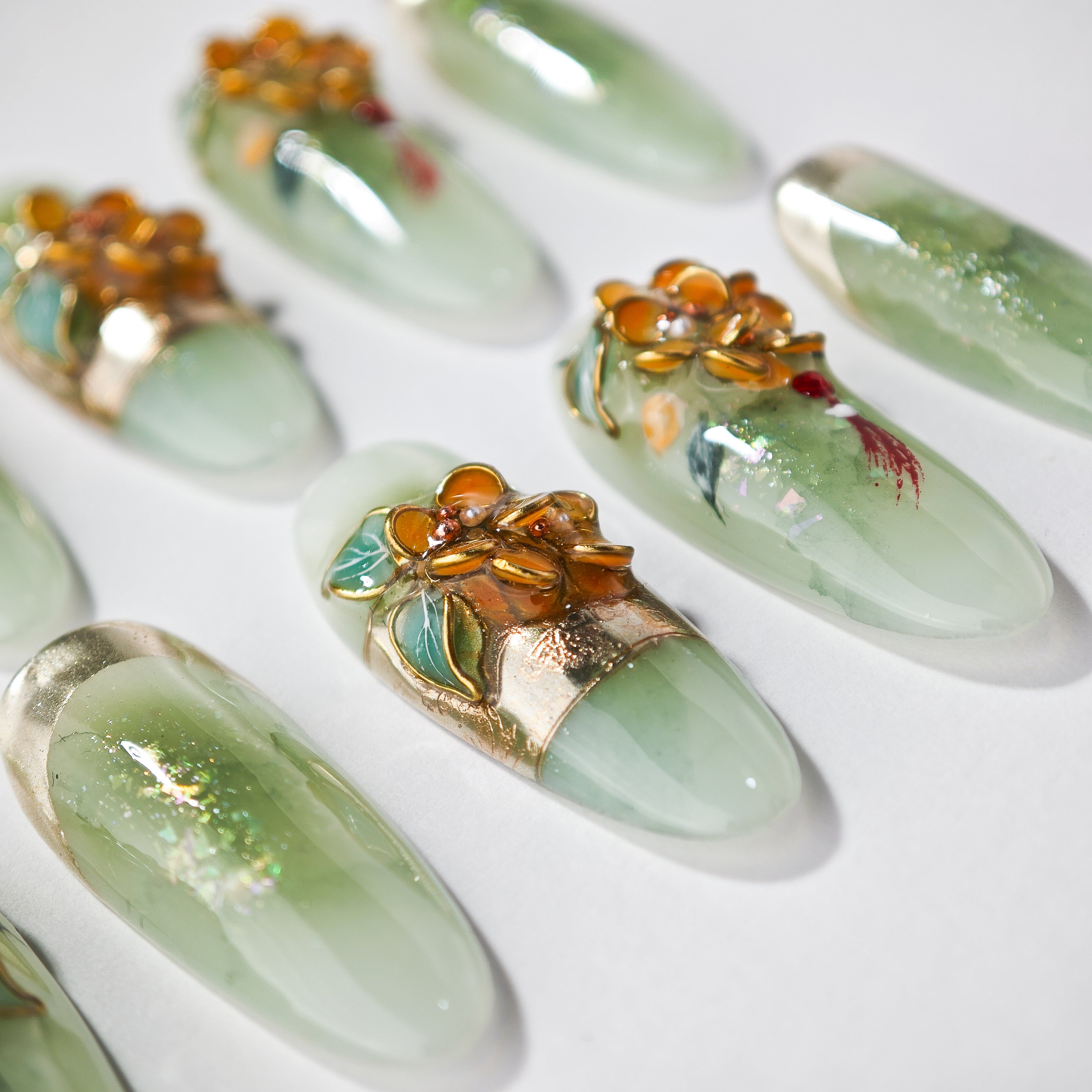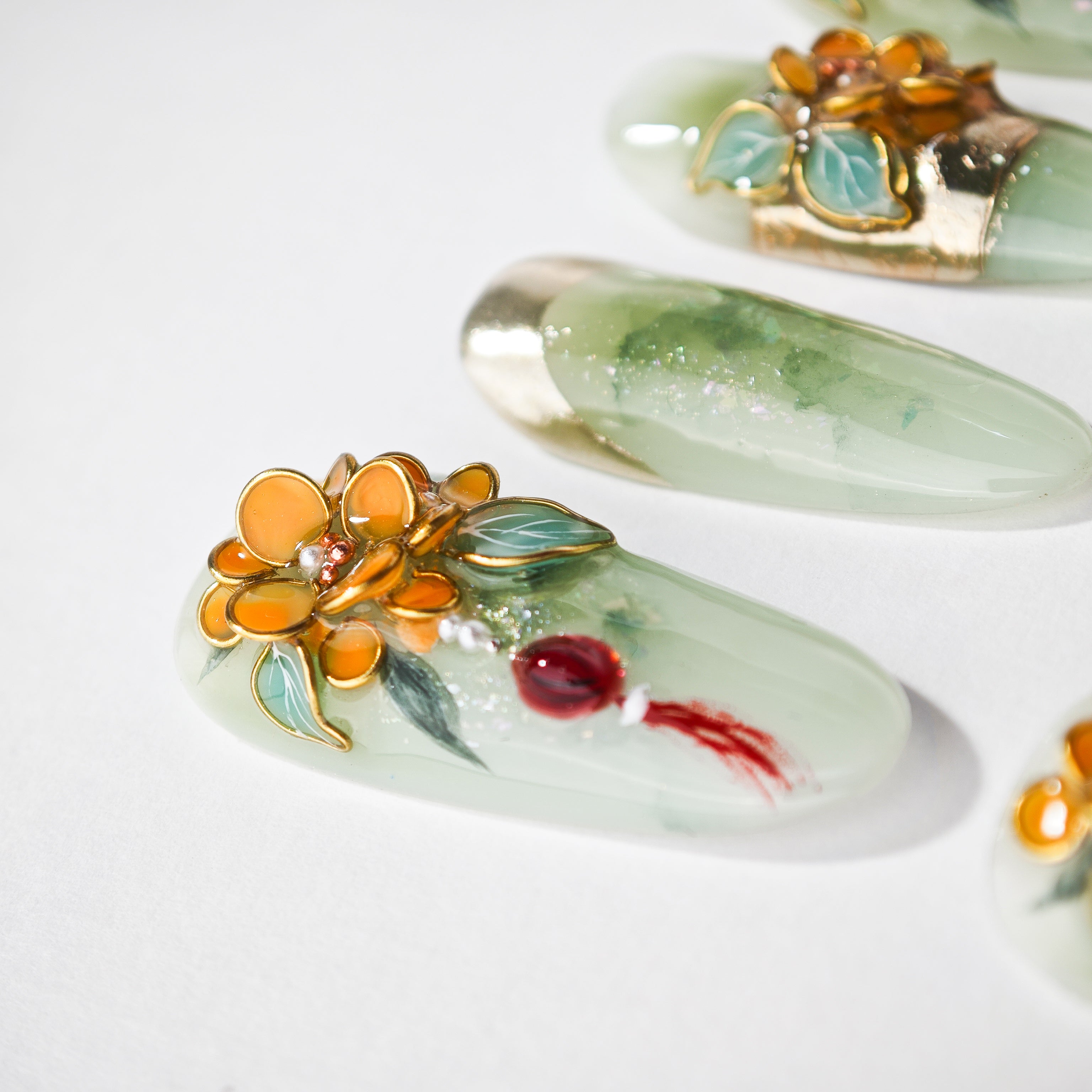 Explore Emily’s Nail’s Golden Blossom Serenity press-on nails, featuring delicate flower designs with gold accents for a serene and elegant look.