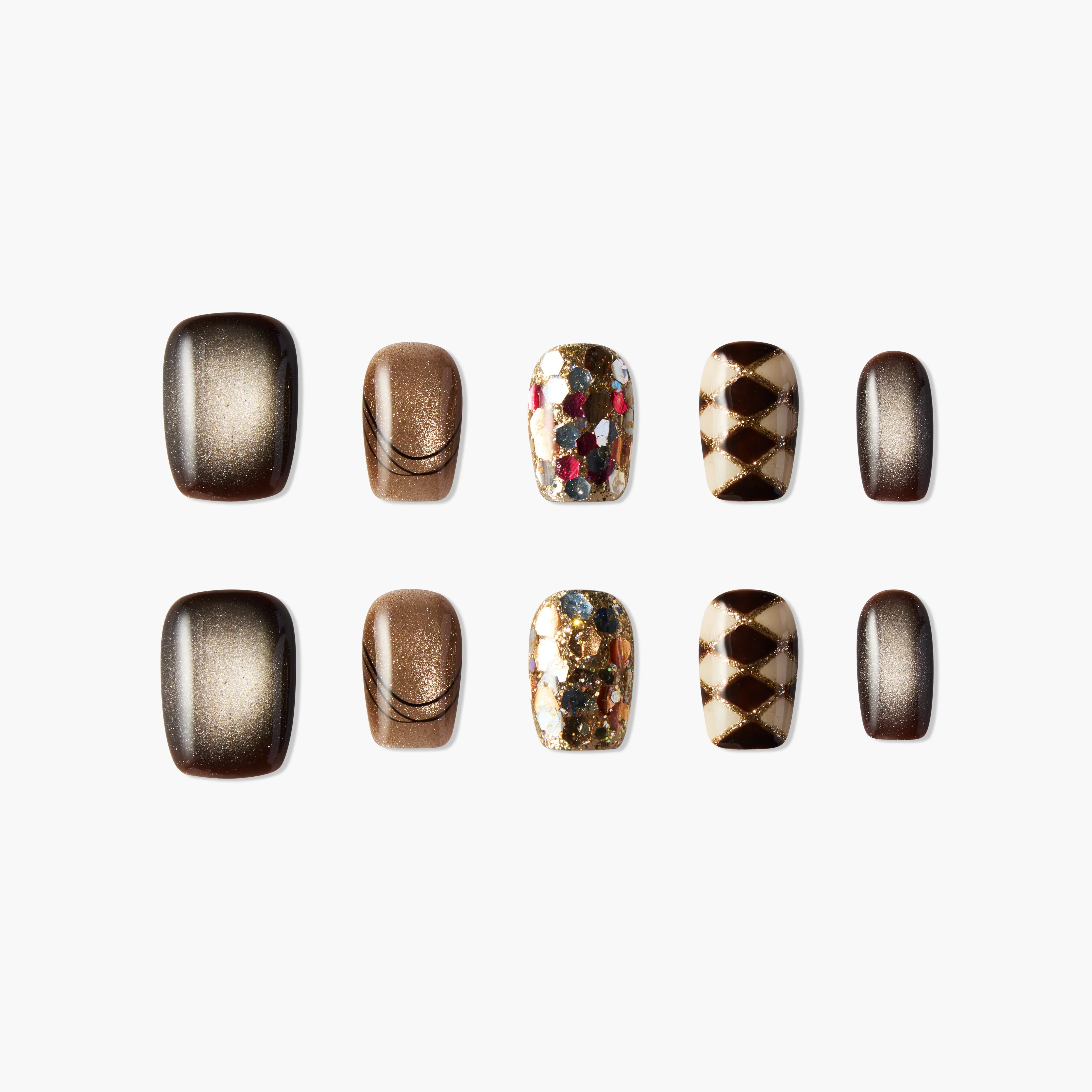 Golden Luxe combines shimmering gradients of black and gold with intricate patterns of glitter, metallic accents, and diamond-shaped designs. The interplay of deep tones and bold geometric patterns exudes sophistication and opulence. Ideal for formal events, glamorous parties, or adding a luxurious flair to your everyday look, this nail set is a statement of timeless elegance.