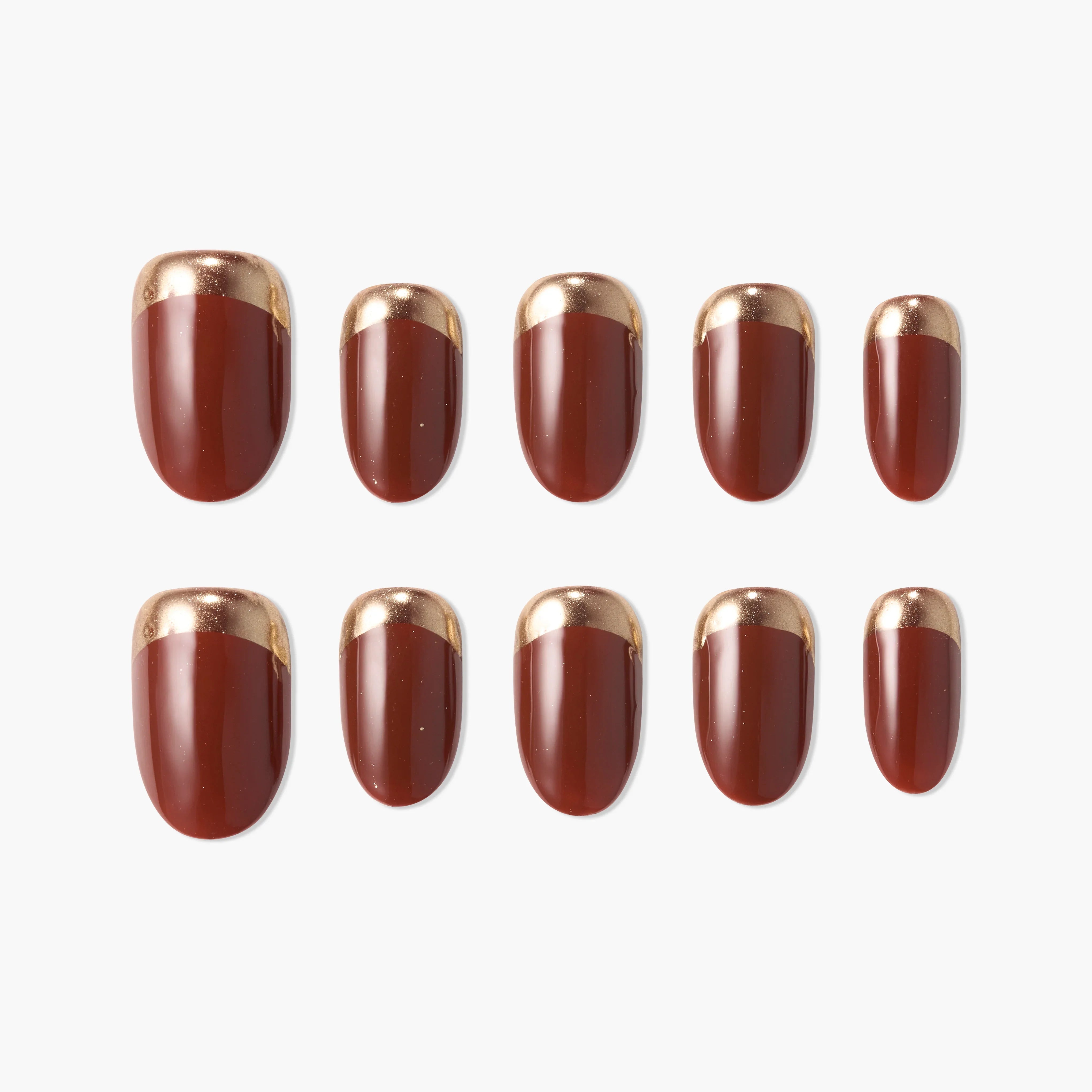Handmade press-on nails by Emily’s Nail featuring a deep mocha brown base finished with soft metallic gold tips. This minimal yet elegant design delivers salon-quality results with a comfortable fit. Reusable and lightweight, these press-on nails are ready in 10 minutes and perfect for daily wear or refined occasions.