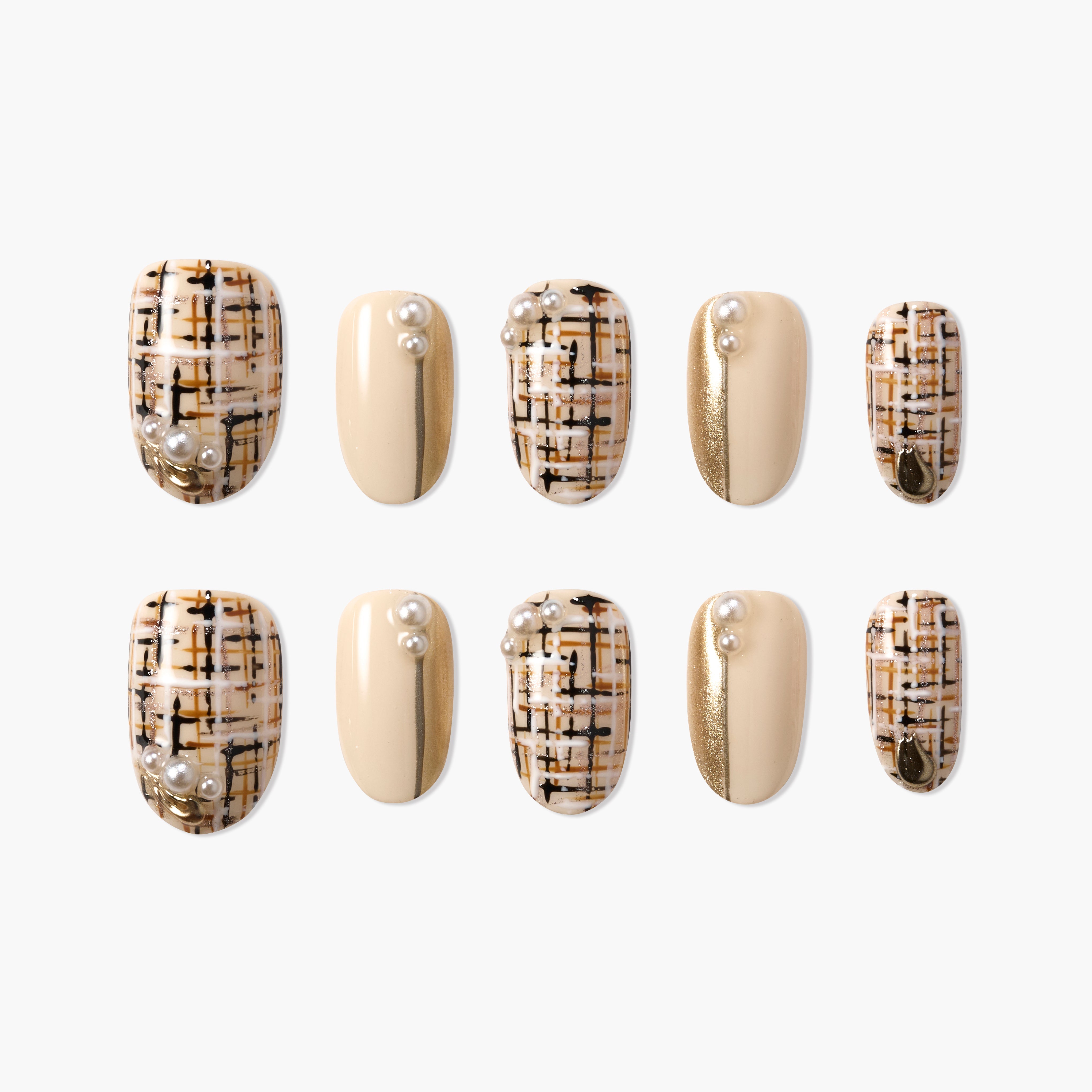 Golden Tweed Charm blends a warm beige base with a hand-painted tweed pattern in black, brown, and ivory for a refined textured look. Gold metallic accents deepen the richness, while small pearls add a soft, elegant contrast. The combination of structured lines and luminous neutrals creates a polished and modern chic style.