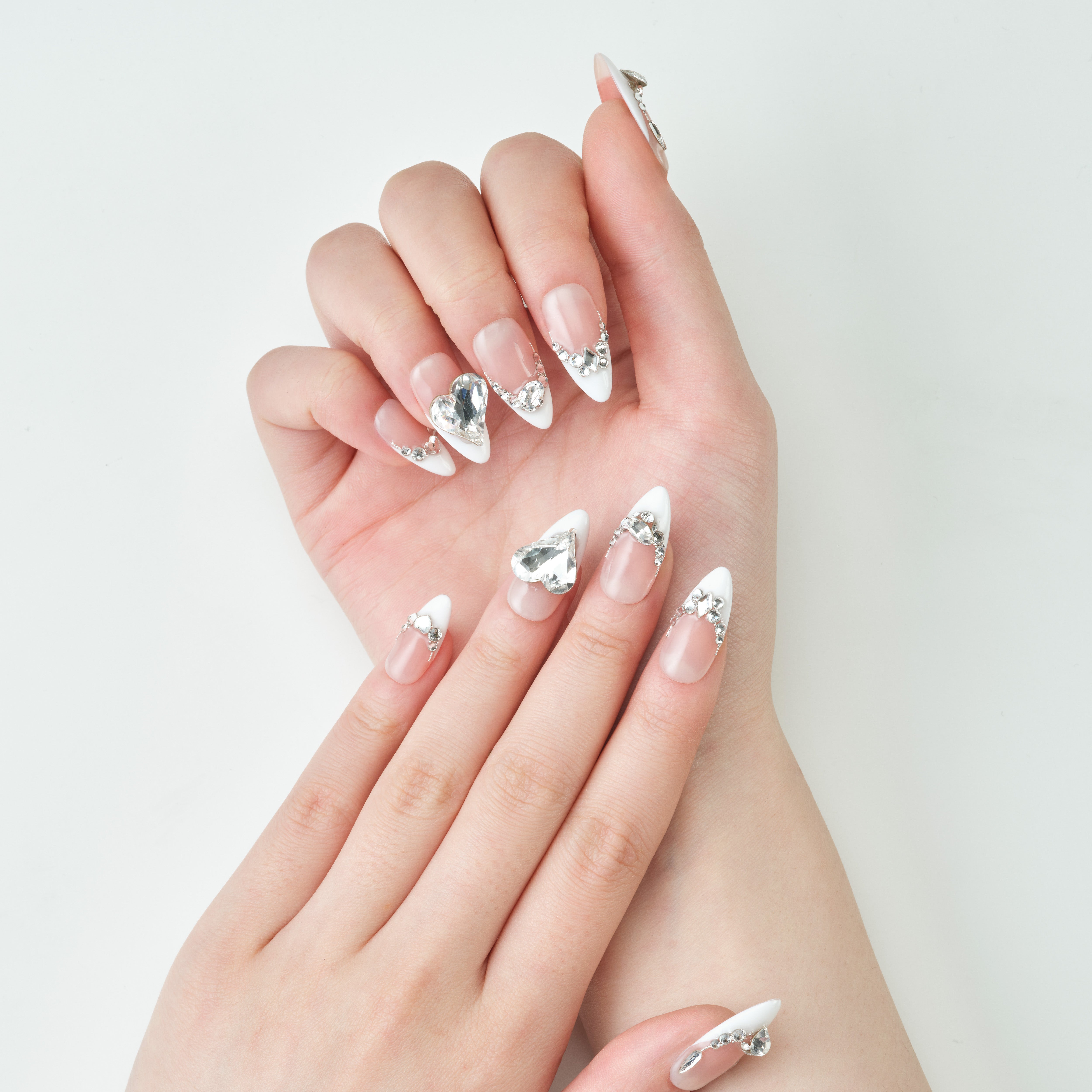 Heart Diamond French features a timeless pink-to-white gradient French base, adorned with dazzling heart-shaped rhinestones and pearl accents, exuding a romantic and luxurious vibe. Intricate rhinestone arrangements and 3D embellishments add depth and elegance to the design. Perfect for weddings, dates, or any special occasion, this nail set makes your fingertips the ultimate expression of love.