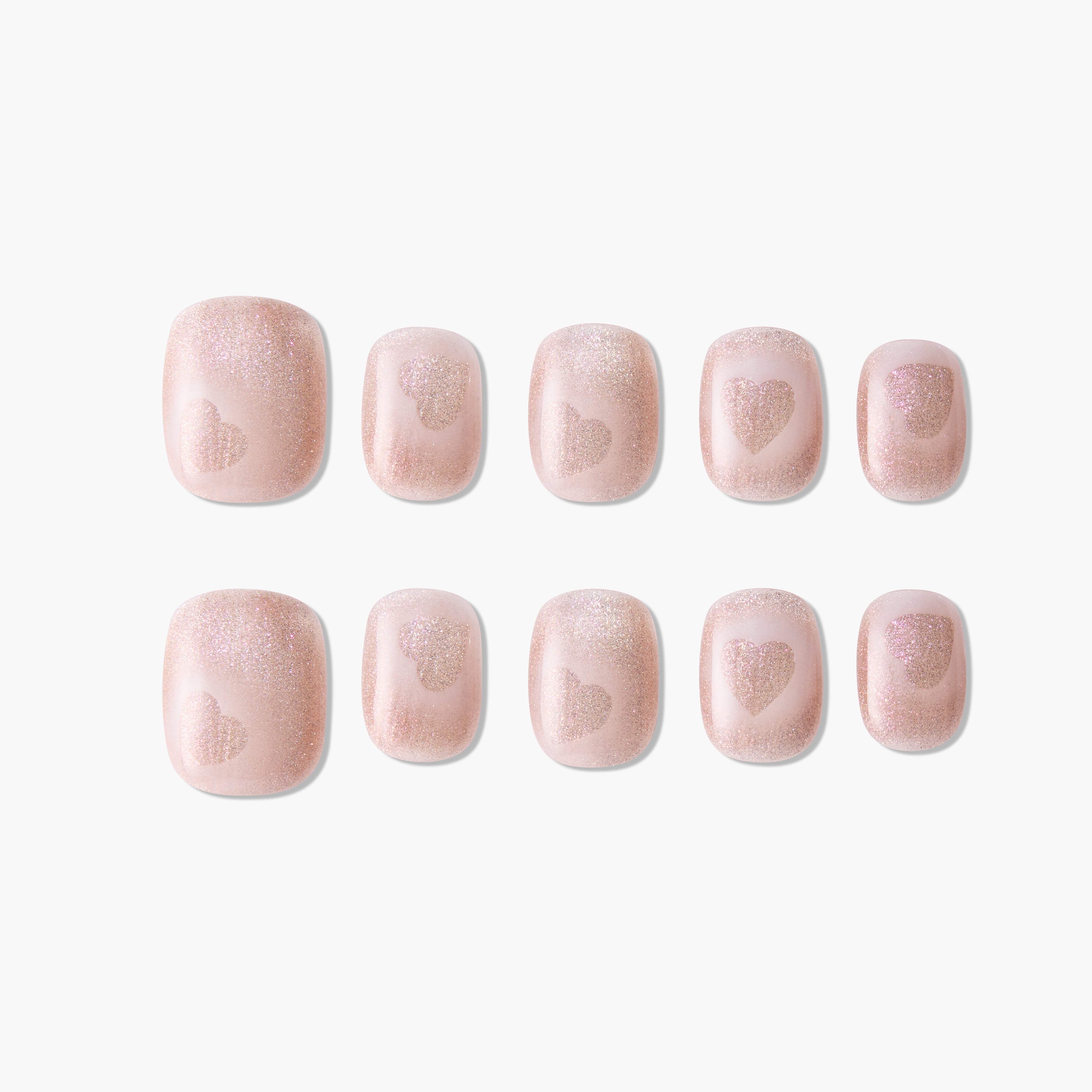 Experience romance with our "Heartfelt Pink Glow" nail design. Delicate gold glitter and soft heart-shaped patterns create a dreamy, gentle aura. Perfect for everyday wear, it's simple yet sweet.