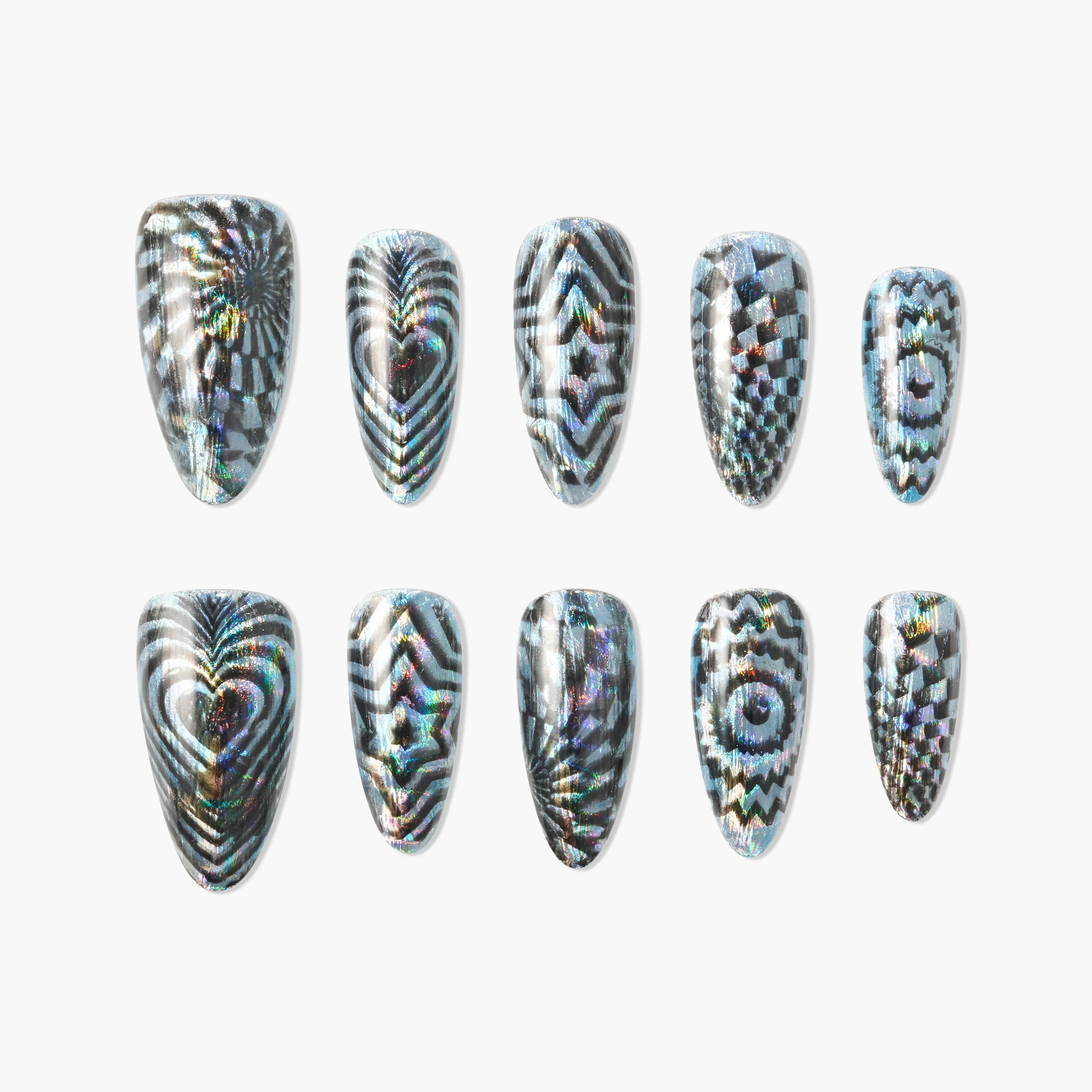 Holo Motion Maze is a handmade press-on nail set featuring black-silver optical illusion patterns with holographic rainbow reflections. The shifting light effect creates a mesmerizing 3D motion look, enhanced by bold geometric hearts, stars, and maze-like designs. Futuristic, eye-catching, and ready in 10 minutes for a statement finish.