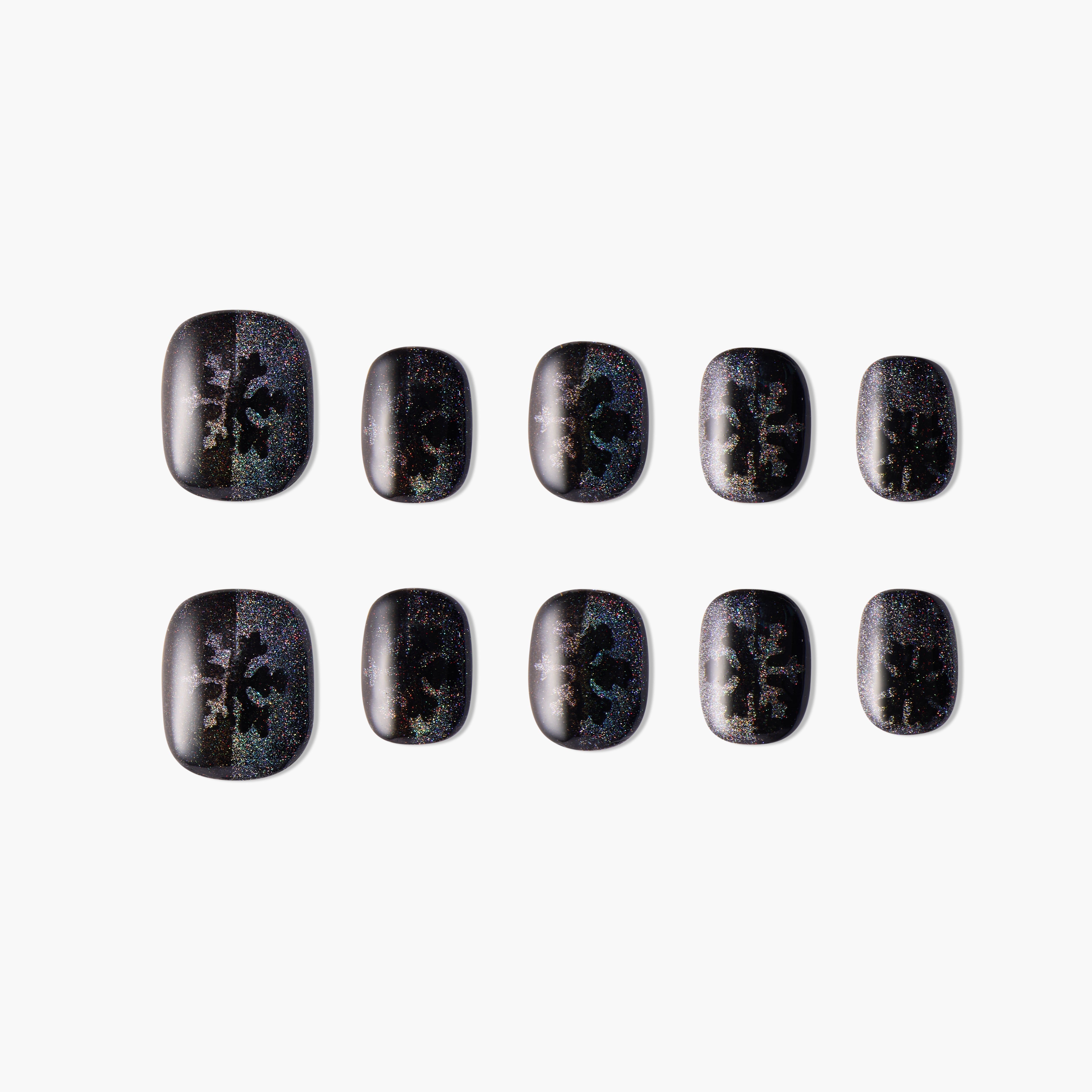 These chic black nails feature a dazzling holographic shimmer with intricate snowflake designs, creating a mystical and festive look. The combination of shimmering colors and bold patterns makes these nails perfect for adding a unique, eye-catching touch to your style.