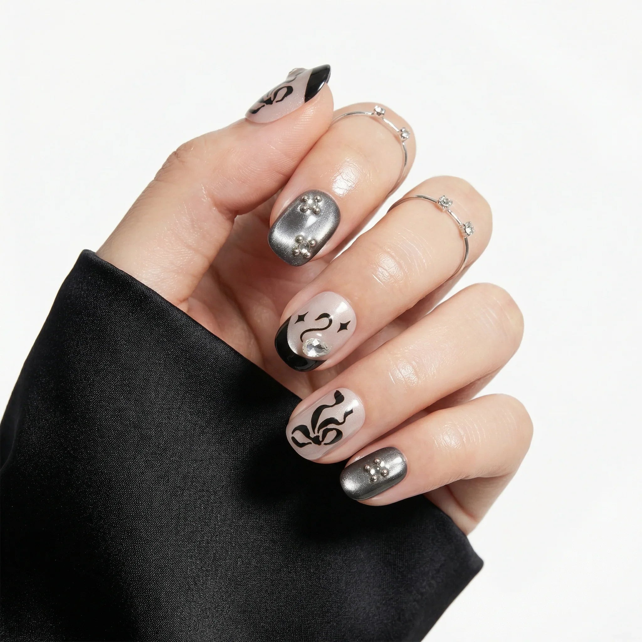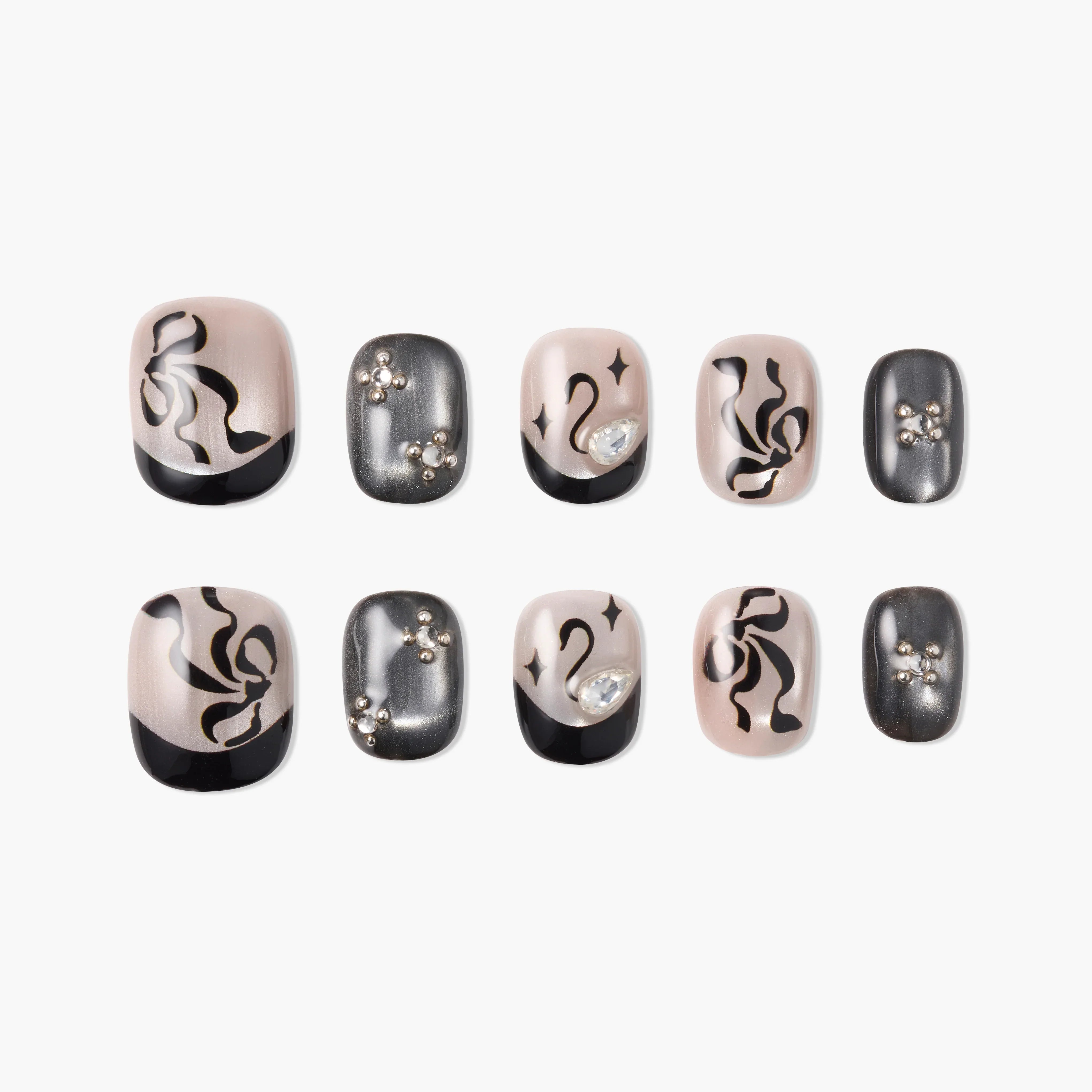 Handmade press-on nails by Emily’s Nail, designed with an abstract black French base, fluid ink-like patterns, and subtle crystal accents. Soft nude tones meet smoky metallic shades for a modern, artistic look. Each set is handcrafted for a salon-quality finish, reusable wear, and effortless application—ready in 10 minutes.