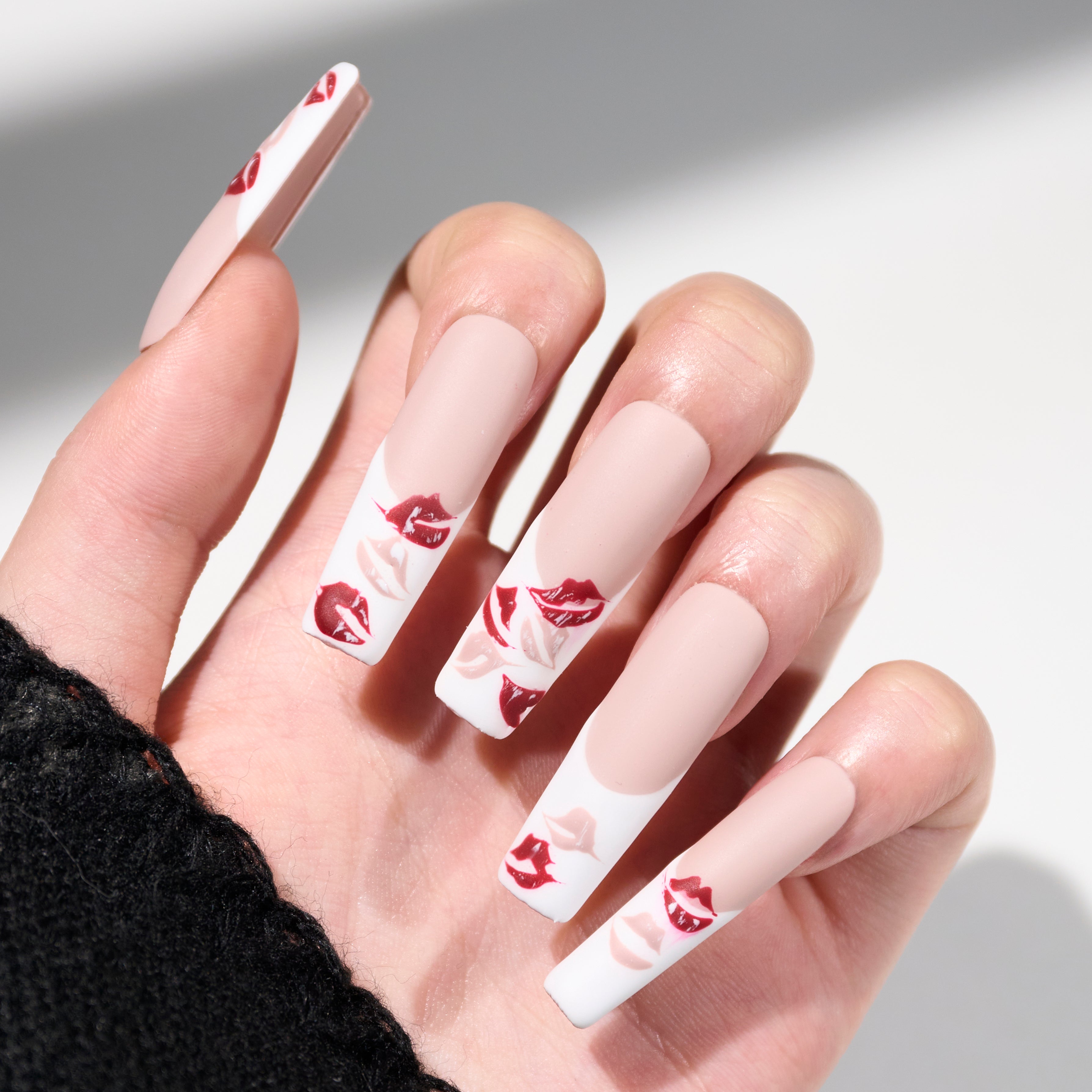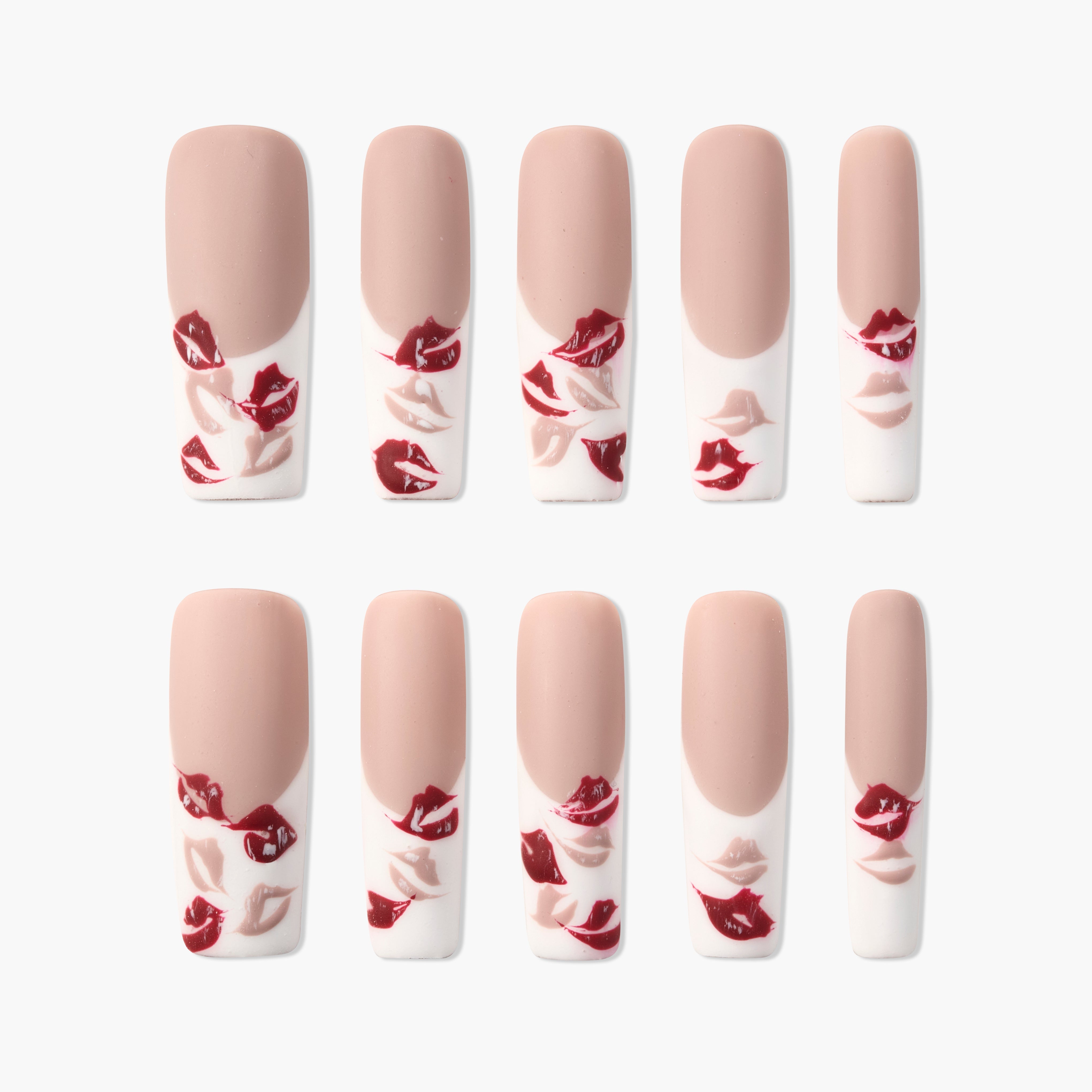 Kiss Me Twice is a bold yet playful statement of modern romance. The nude matte base meets crisp white tips, adorned with layers of soft beige and deep crimson lip prints. Each kiss mark is delicately hand-painted, creating a pop-art inspired design that balances sensuality with chic minimalism. Perfect for those who love an artistic twist on elegance, this set turns every gesture into a whisper of confidence and charm.