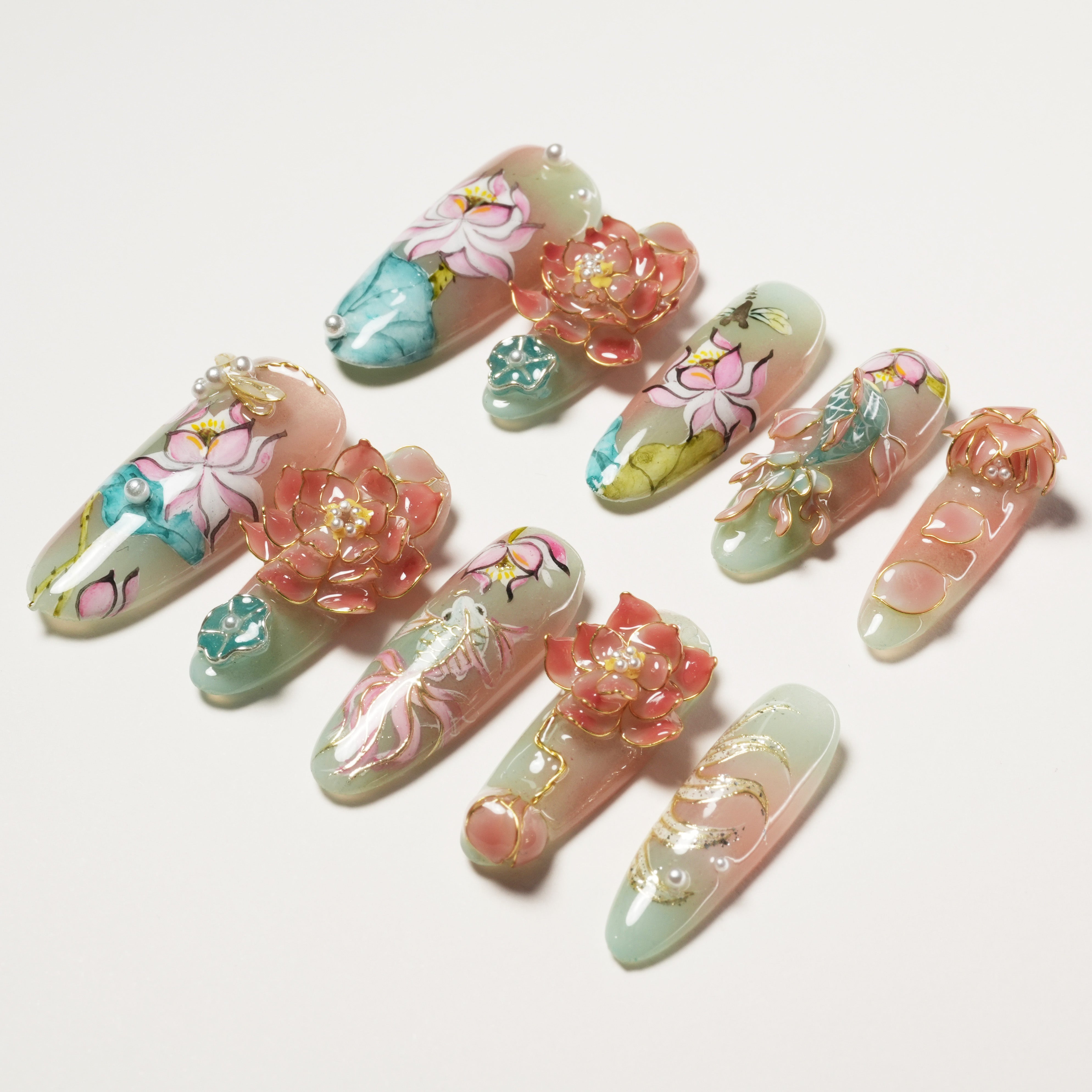 The "Lotus Dance Dream" press-on nails feature intricate lotus flower patterns and soft pastel tones, enhanced by beautiful gems and golden edge details, exuding elegance and romance. The unique lotus shapes and delicate gloss on each nail evoke the warmth and freshness of spring, bringing nature to your fingertips. The subtle colors and jewel accents complement each other, adding a dreamlike and mysterious charm. This design incorporates the exquisite art of cloisonné, a traditional Chinese craft renowned for its meticulous detail and stunning visual effect. The cloisonné technique adds a layer of artistry and cultural richness, making these press-on nails a true reflection of the finest craftsmanship. Perfect for any occasion.