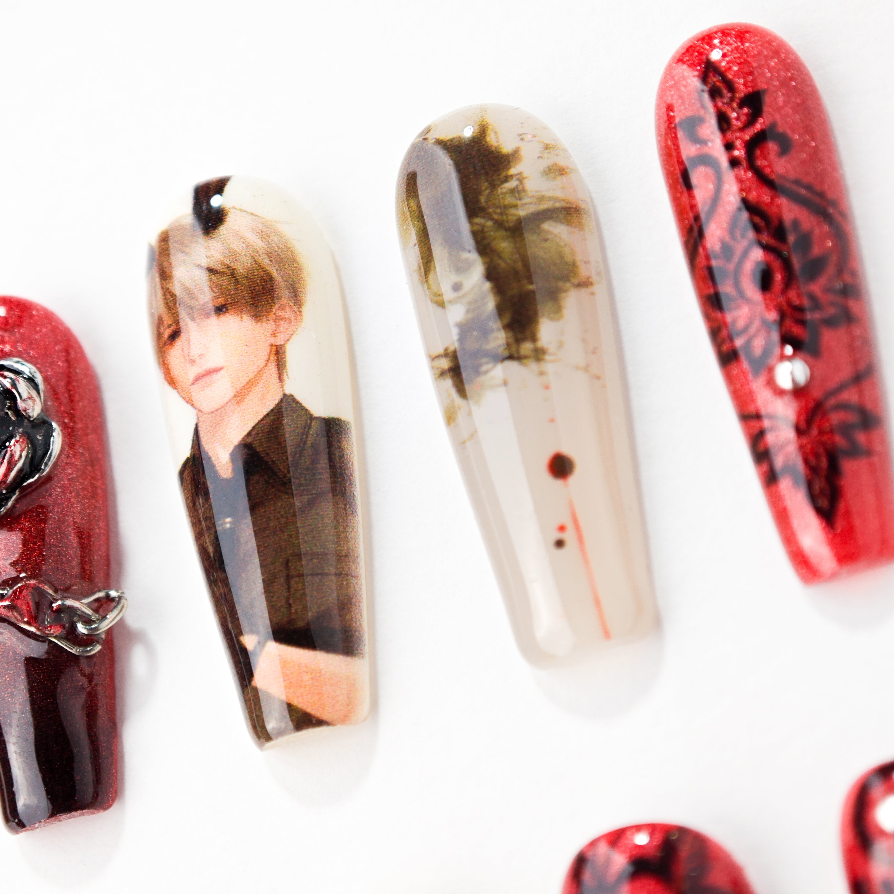 Emily’s Shen Xinghui handmade nail series is inspired by the beloved character from Love and Deepspace. Featuring a striking red and black palette with roses, chains, and gemstone details, this design embodies his mysterious allure and passionate charm. Perfect for fans, special occasions, or everyday elegance.