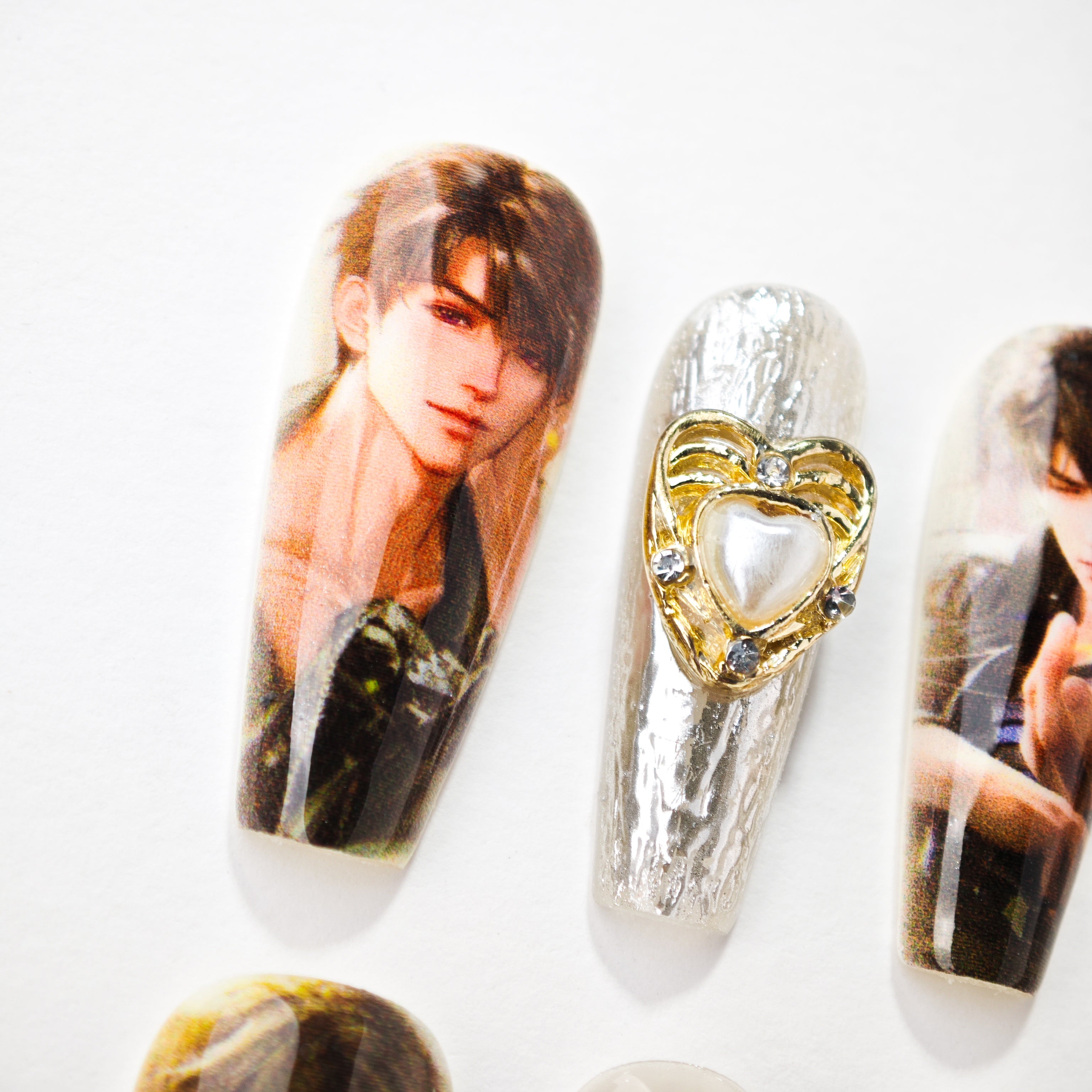 Emily’s Xia Yizhou handmade nail series is inspired by the popular character from Love and Deepspace. Featuring detailed character artwork paired with hearts, flames, roses, and star motifs, this design captures his tender yet protective charm. Perfect for fans, anniversaries, dates, or everyday wear.