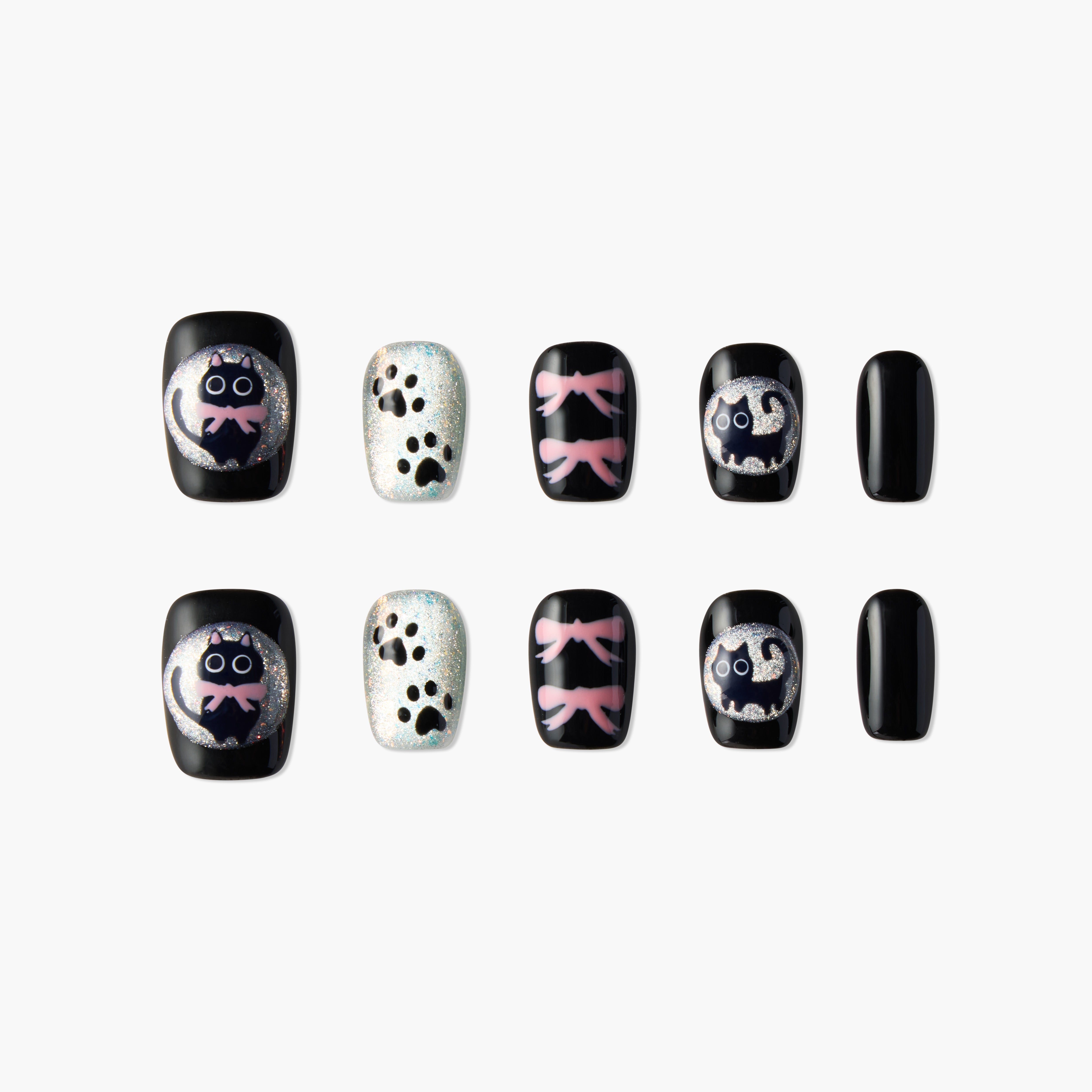 Midnight Kitty combines classic black with sparkling silver, creating a mysterious yet adorable vibe. The design features playful black cats, pink bows, and cat paw prints, capturing the fun of a cat's nighttime adventures. Perfect for both everyday wear and special occasions, this nail set lets your fingertips showcase personality and elegance, ideal for cat lovers and those who enjoy a unique style.