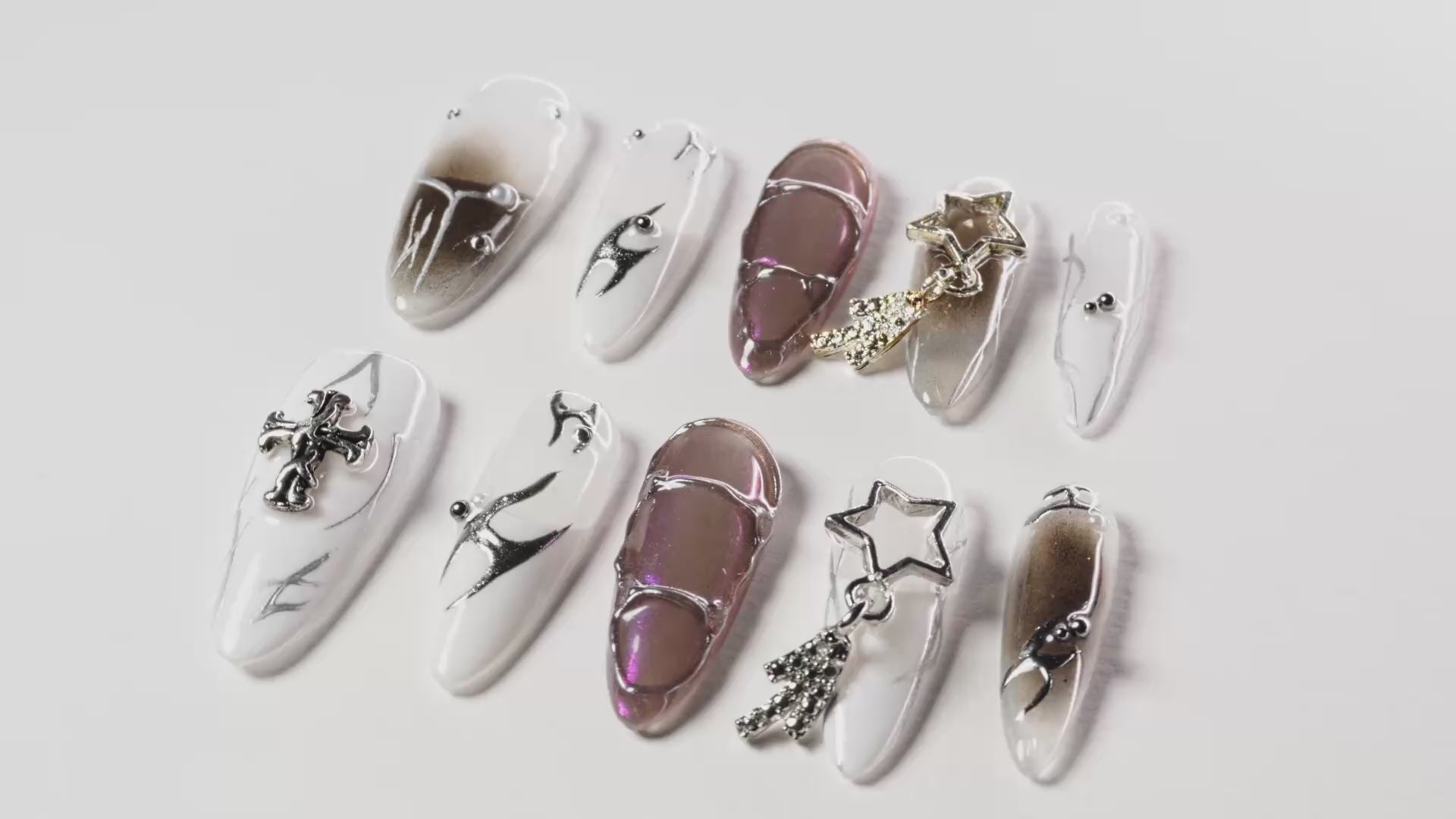 Mystic Elegance combines deep hues with metallic sheens, presenting an aura of mystery and sophistication. The interplay of deep purple and metallic tones is like the collision of the night and the stars, with embellishments such as stars and crosses adding an air of intrigue. The fusion of metallic accents with delicate lines gives a sense of elegance, like flowing threads under the night sky. This design is ideal for those who appreciate a combination of uniqueness and mystery in their nail art.