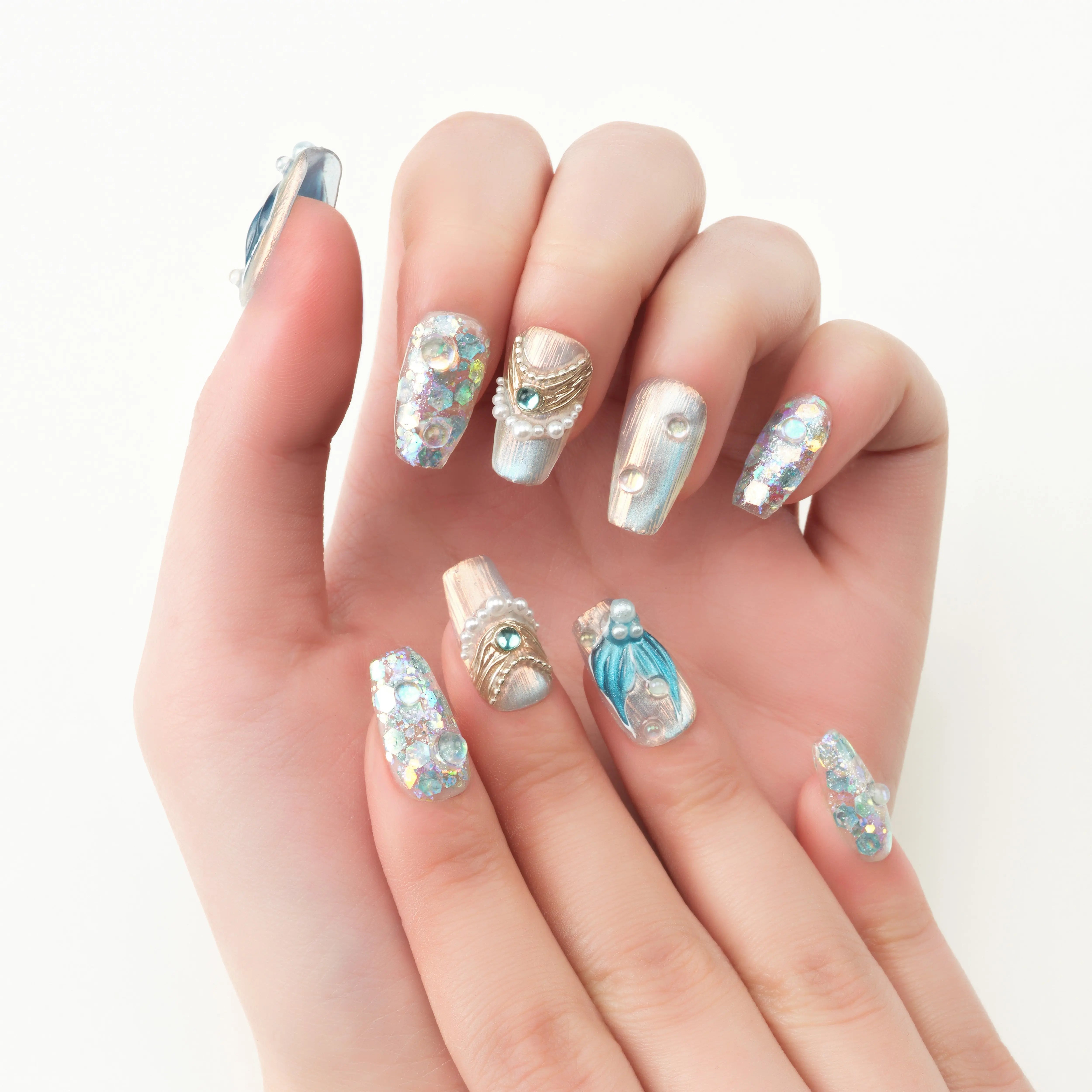 Ocean Dreamscape is inspired by the enchanting beauty of the ocean, featuring shimmering pearlescent blues, pearl accents, 3D shell elements, and crystal embellishments that capture the allure of an underwater world. Each nail is adorned with layered glitter, creating a sparkling effect reminiscent of sunlit waves. Perfect for those who love a mysterious, romantic style, this nail set adds a touch of elegance and vibrancy to your fingertips, ideal for vacations or special occasions.